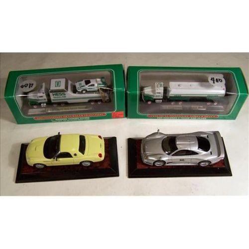 MODELS - 2 HESS TRUCKS- TANKER & RACER TRANSPORT AND ROAD & TRACK THUNDERBIRD & MERCEDES CLK-GTR