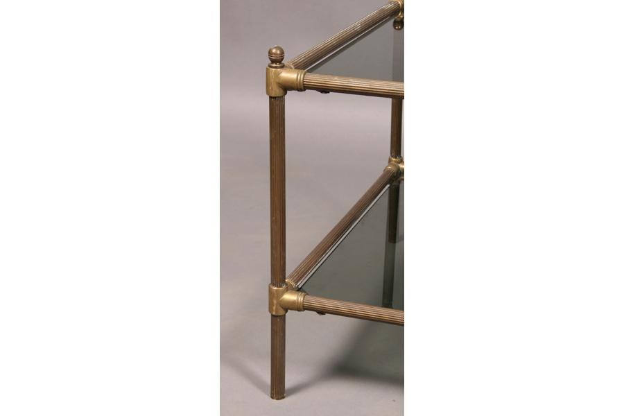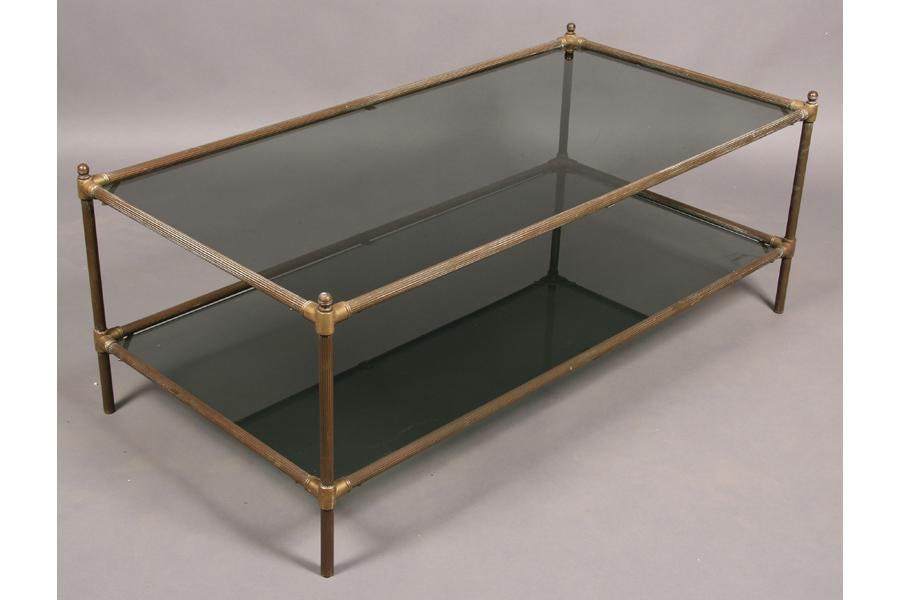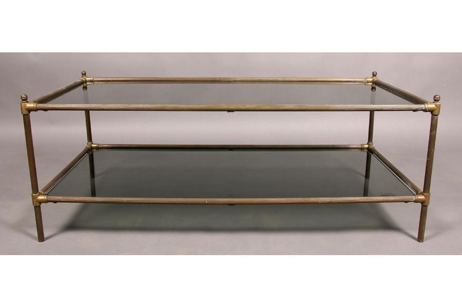 Mid century modern two tiered coffee table with brass corner finials and reeded frame circa 1960. Smoked glass top and shelf. Ht: 18" Width: 47" Depth: 25.5" ***PLEASE NOTE: All property shall be paid for by the purchaser within five (5) business days of the sale. Kamelot Auctions accepts cash (In house only), personal checks, certified checks and money orders. We do not accept credit cards or Paypal under any circumstances. Please note our policy regarding payments from International buyers: The only acceptable method of payment is a bank wire/bank transfer. For invoices more than $1000, there is no additional fee for this service. For invoices less than $1000, please include an additional $25 wire fee. We will be happy to forward our bank wiring information after the completion of the auction. Thank you for your understanding and cooperation. All purchases must be removed within 15 business days after an auction. Property not removed from our facility after 15 business days will be moved to an off-site storage facility at a charge of $10.00 per day payable by the buyer. Kamelot does NOT provide shipping services or estimates. However, we recommend the following independent shipping services: Antique Transport Co. at antiquetransport@cs.com, Farren Transport at farrentransport@comcast.net or All Points Shipping at jb@allpointsshippingnj.com for quotations and shipping arrangements for furniture and other large items that would require a blanket wrap shipping company. For quotations and shipping arrangements for smaller items that would traditionally be shipped through UPS, please contact The UPS Store at store4744@theupsstore.com or The Packaging Store at hrpa112@aol.com. Clients are welcome to pick up their items from our location or make their own shipping arrangements.