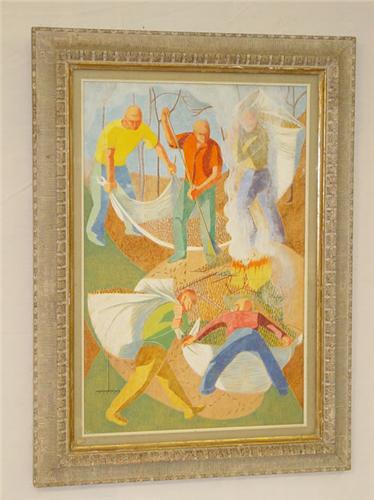 MODERN ART OIL ON WOODEN BOARD OF 5 LEAF RAKERS W/ RAKES & LEAF BURNING OUTDOORS, UNSIGNED IN A CUSTOM CARVED PLASTER FRAME (30" X 20") - PAINT LOSSES, CHIPS TO FRAME