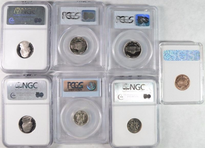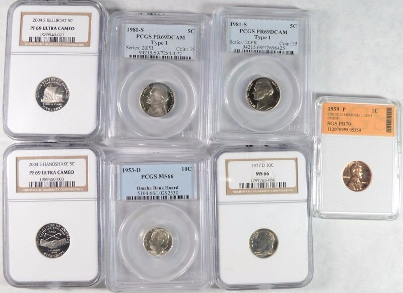 1977-D ROOSEVELT DIME NGC MS-66, 53-D ROOSEVELT PCGS MS-66 OMAHA BANK HOARD, 2 1981-S TYPE 1 PROOF JEFFERSON NICKELS PCGS PR-69DCAM, 2004-S KEELBOAT & HANDSHAKE NICKELS NGC PF-69 ULTRA CAMEO, & 1959 LINCOLN CENT SGS PR-70, ESTIMATE $70 - $80.