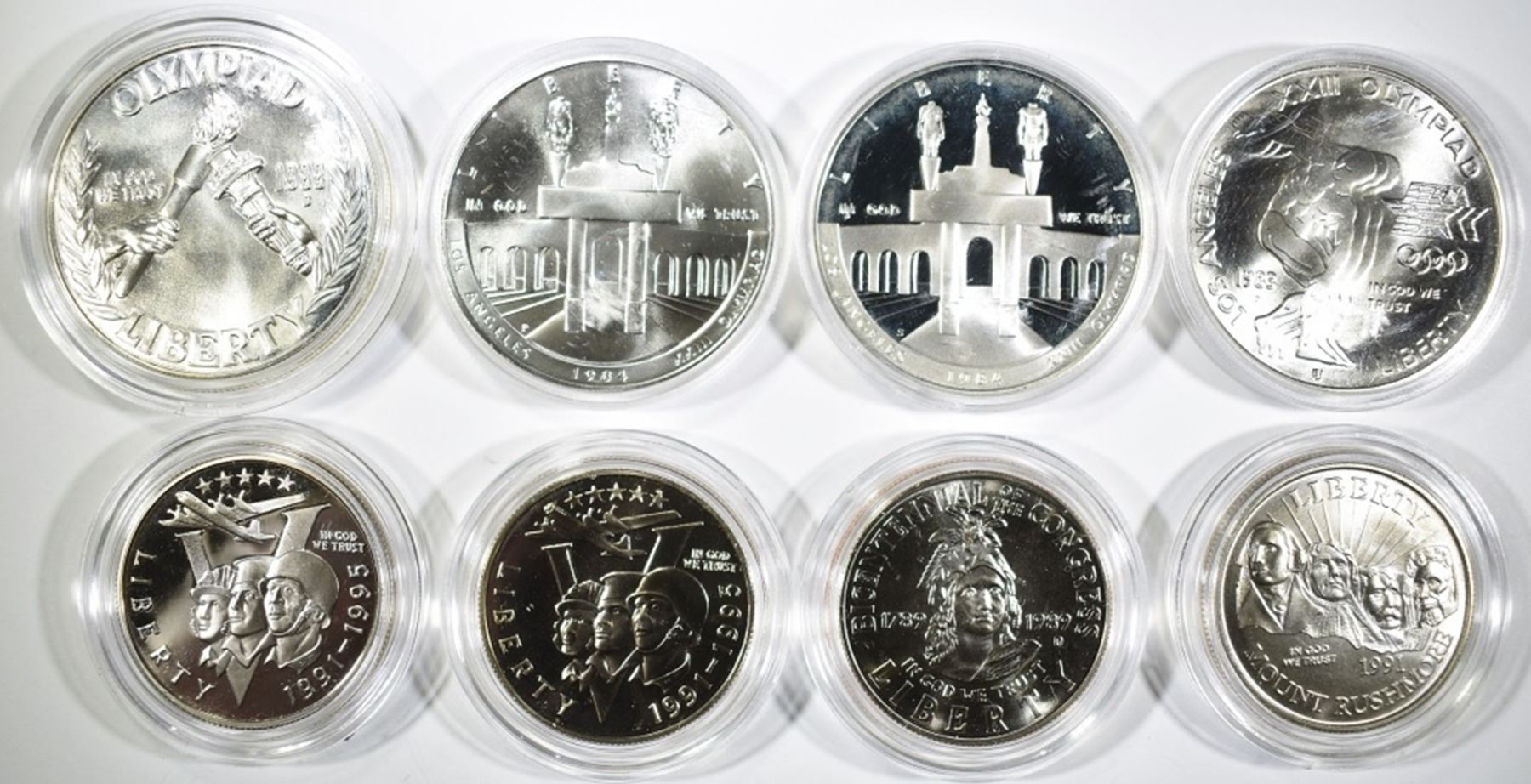 1983, 84 & 88 UNC OLYMPIC SILVER DOLLARS, 1984 PROOF OLYMPIC SILVER DOLLAR, 1991 UNC MOUNT RUSHMORE HALF DOLLAR, 1989 UNC CONGRESSIONAL HALF & 1995 PROOF & UNC WWII HALF DOLLARS ESTIMATE $100 - $120.