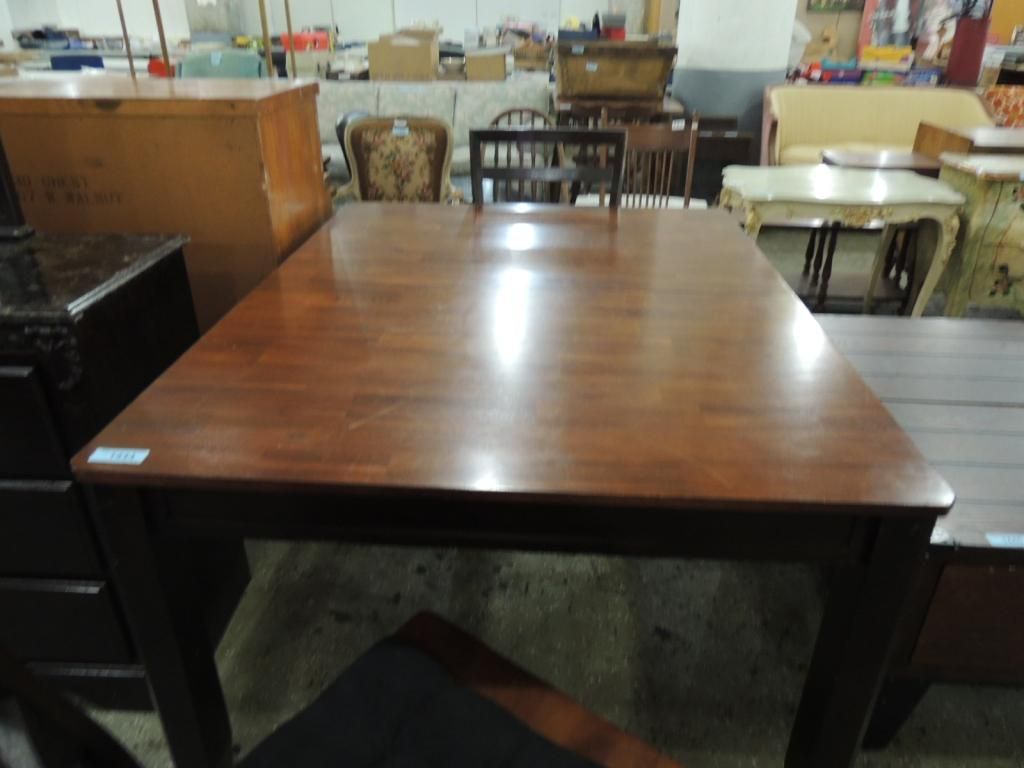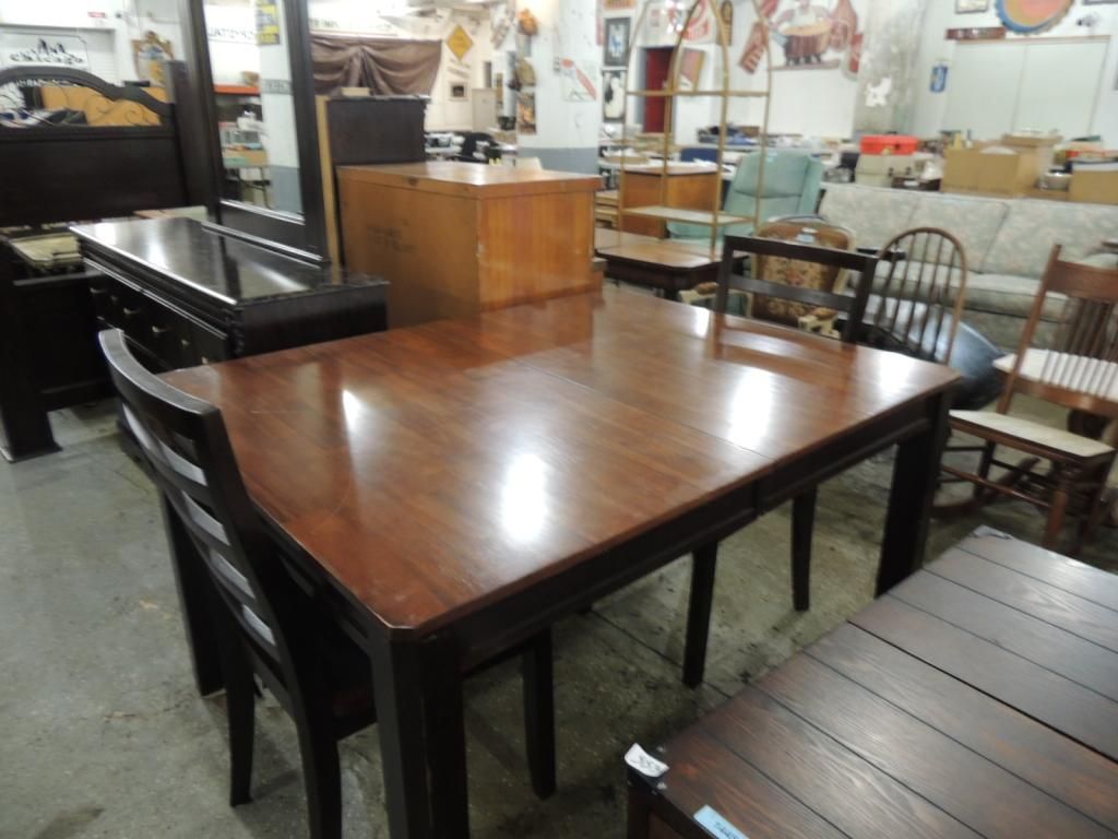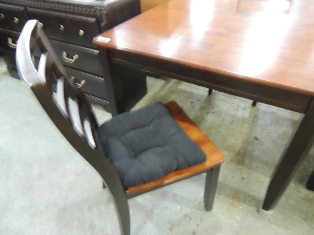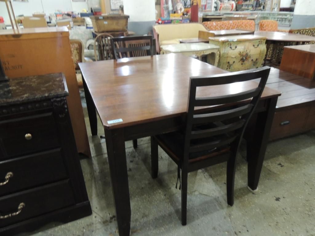 DARK WOOD MODERN CONTEMPARY DINNING TABLE WITH TWO CHAIRS. AS SHOWN. SEE PHOTO FOR MORE DETAILS.