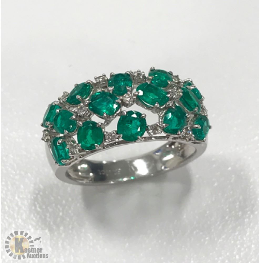 SIZE: 6.5 WEIGHT: 4.83 GRAMS METAL: 18K WHITE GOLD EMERALDS CARAT: 14 = 2.40 CTW COLOUR: GREEN CUT: OVAL DIAMONDS CARAT: 13= .15CTS T.W. CUT: ROUND BRILLIANT CUT RETAIL $8,010.00 SKU:554-10191