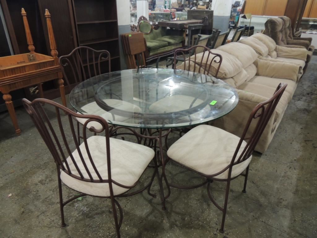 MODERN STYLE DINING TABLE & FOUR CHAIRS IRON METAL BASE GLASS TOP ROUND DINING TABLE WITH FOR CHAIRS, AS SHOWN SEE PHOTO FOR MORE DETAILS.