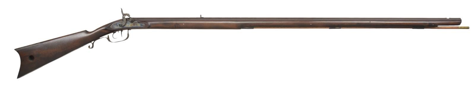Cal. 45. NSN. Bbl. 42" octagon. Top flat is marked "L.W.F.". Dovetail mounted German silver blade front sight w/ fixed V notch semi buck horn rear sight. Side lug style bolster. Engraved case colored trade lock & hammer. Double set triggers having 3/4 curl rear trigger. Pin fastened full length plain maple cheek piece stock. Features include mouldered lower cheek piece edge w/ circular lubricant well on right side. Iron fittings include crescent buttplate, toe plate, finger curl trigger guard, sideplate escutcheons, plain thimble & 2 plain pipes. Brass tipped hardwood ramrod. WEIGHT: 6 lbs, 9.6 ozs. CONDITION: very good. Bbl. & fittings retain 90% dark brown finish. Lock & hammer retain over 90% case colors. Stock has very good finish showing small marks. Trigger must be set for lock to hold in cocked position. Very good bore. (01-22797/DS). ANTIQUE. $500-700.