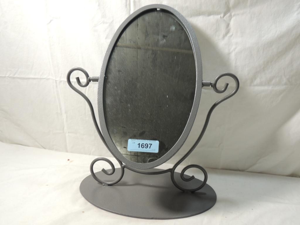 ADJUSTABLE MOVEABLE METAL IRON OVAL MIRROR. AS SHOWN. SEE PHOTO FOR MORE DETAILS.