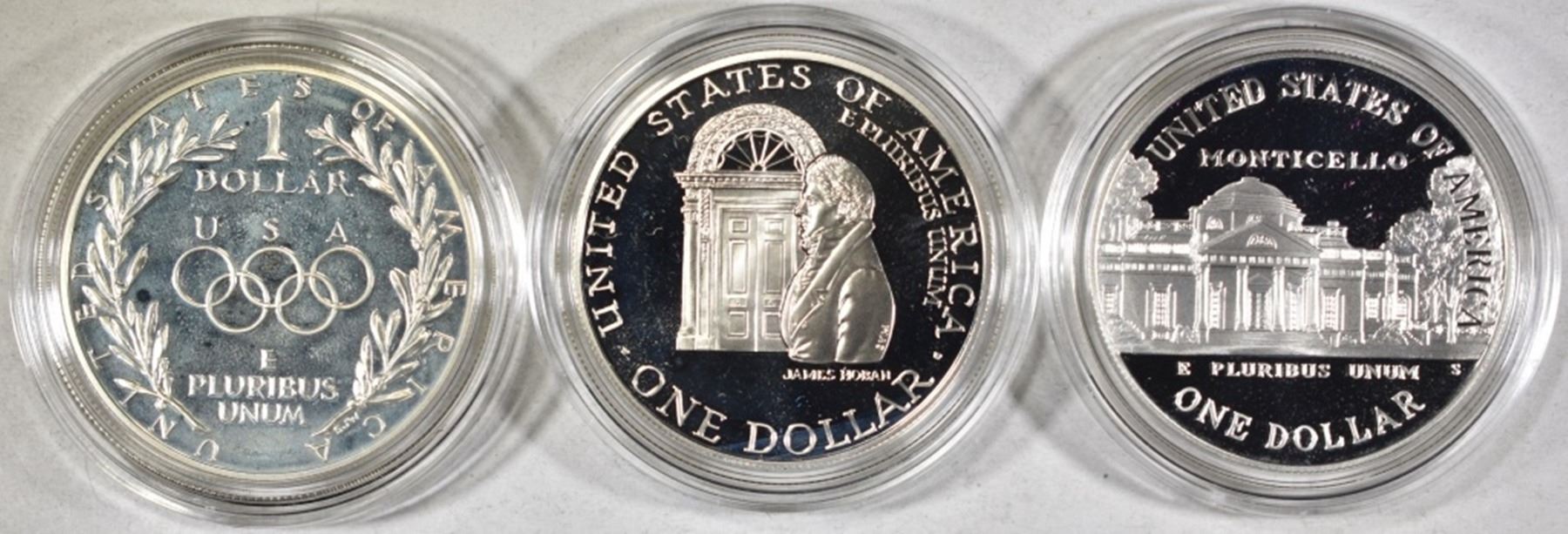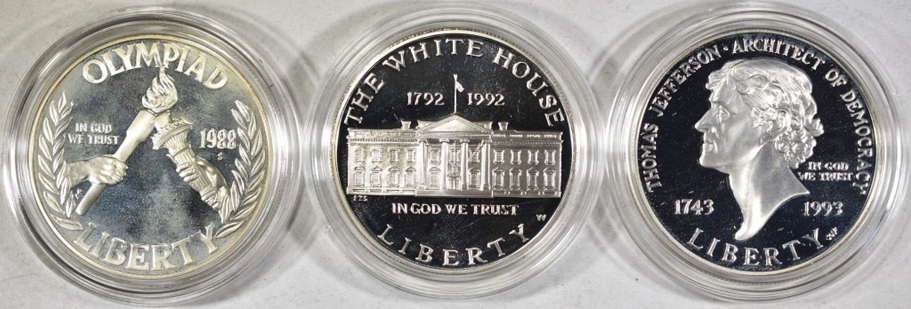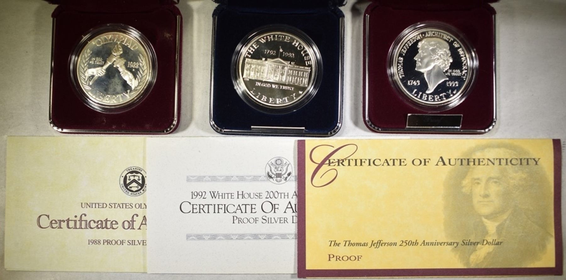 1988 OLYMPIC PROOF SILVER DOLLAR, 1992 WHITE HOUSE & 1993 JEFFERSON ESTIMATE $55 - $65.