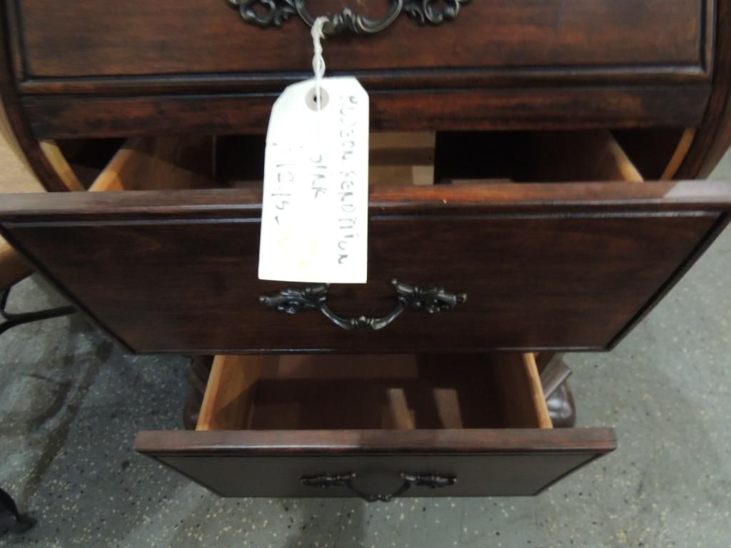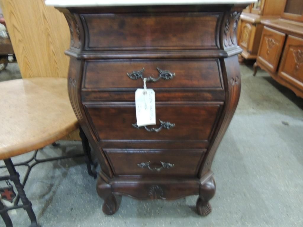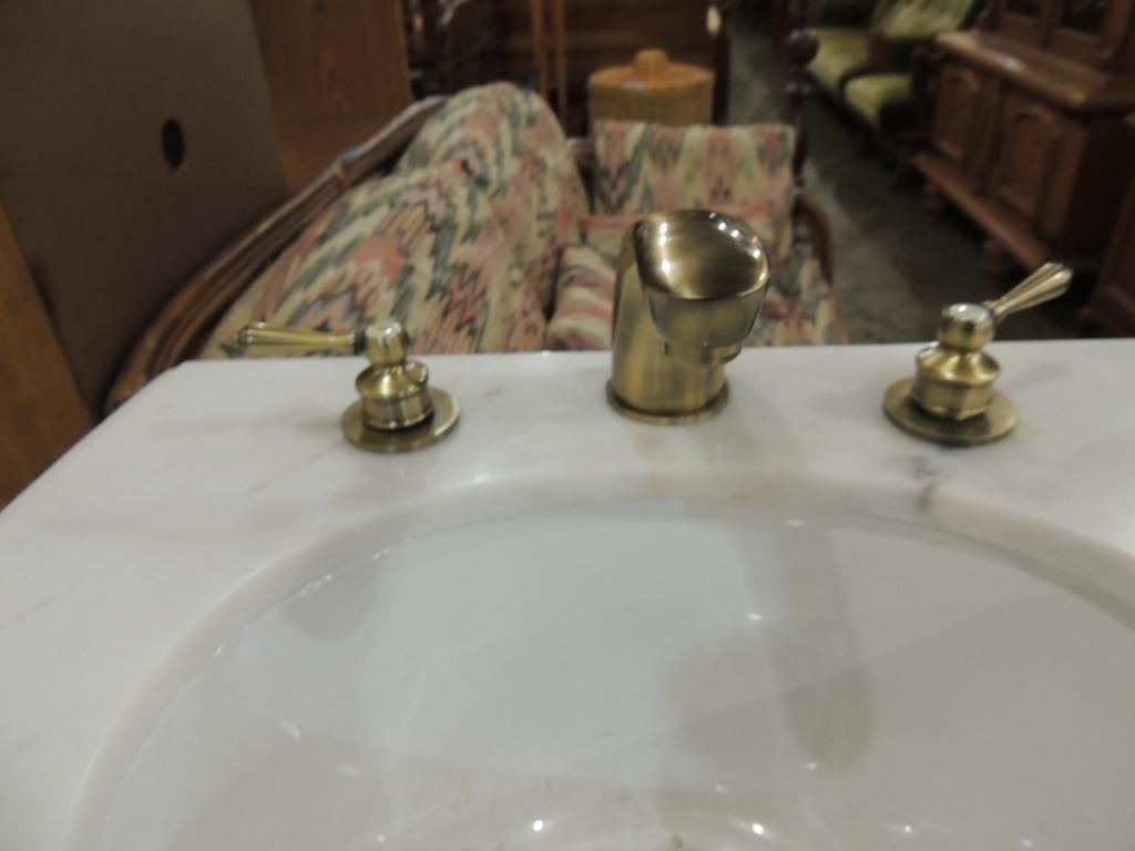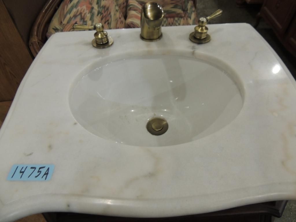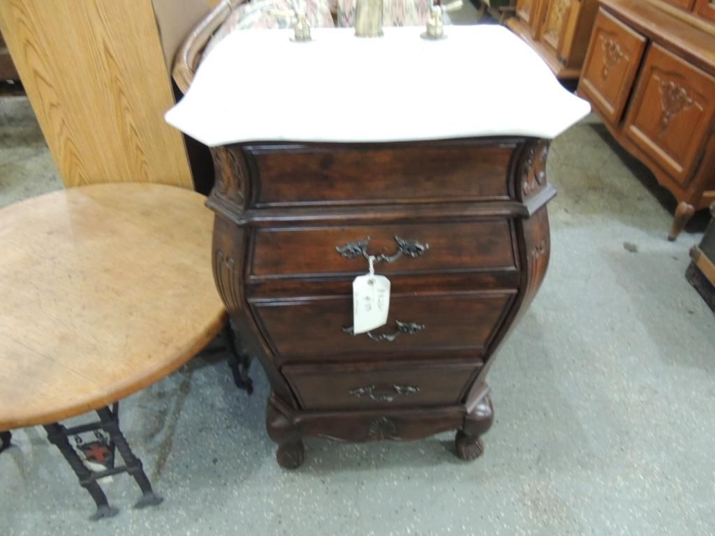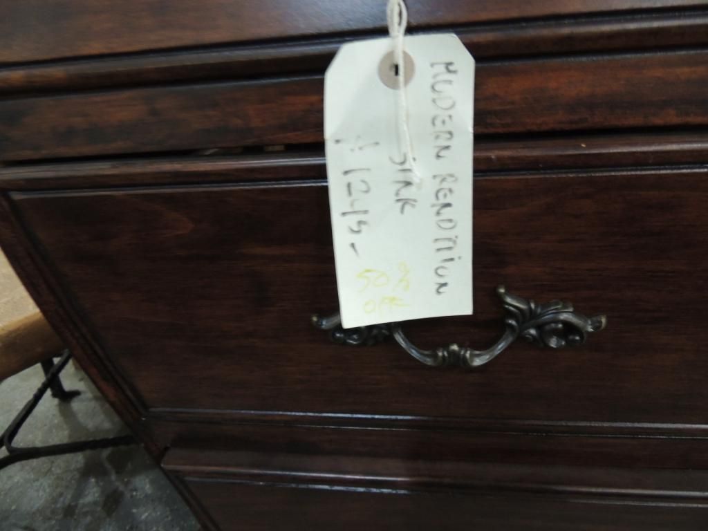 BEAUTIFUL DARK WOOD ANTIQUE STYLE MODERN RENDENTION SINK VANITY. DEEP SINK MARBLE TOP QUEEN ANNE LEGS. AS SHOWN SEE PHOTO FOR MORE DETAILS.