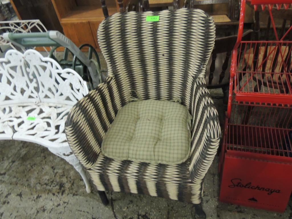MODERN STRIPED DESIGN WICKER CHAIR, ARM CHAIR, INDOOR/OUTDOOR CHAIR WITH CUSHION AS SHOWN SEE PHOTO FOR MORE DETIALS.