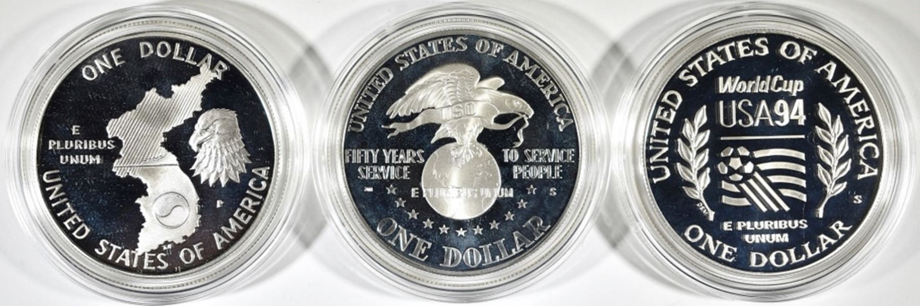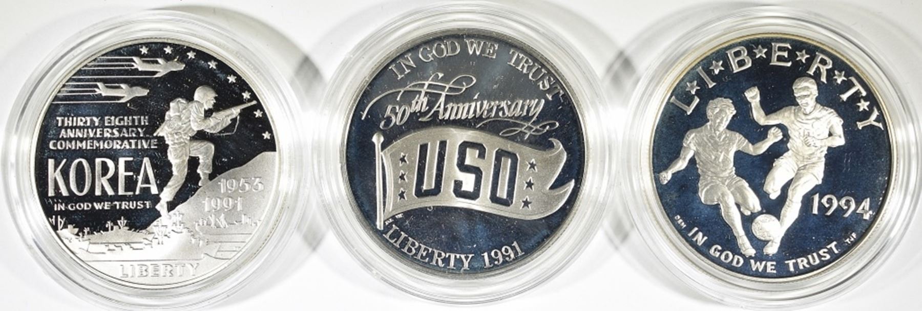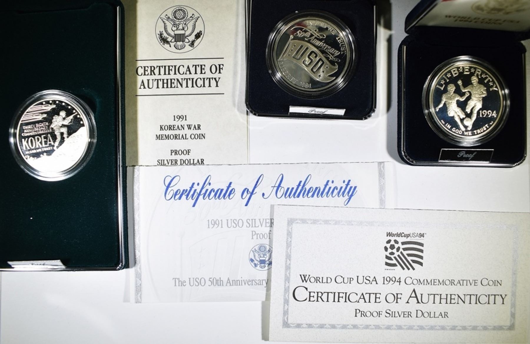 1994 WORLD CUP PROOF DOLLAR, 1991 USO PROOF DOLLAR & 1991 KOREAN WAR PROOF SILVER DOLLAR ORIG PACKAGING ESTIMATE $90 - $100.