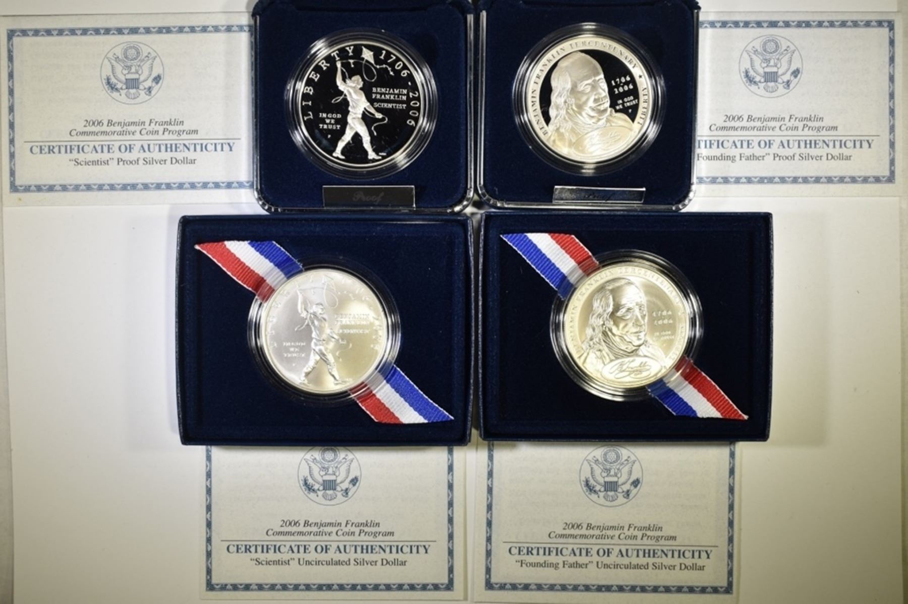 2006 BEN FRANKLIN "FOUNDING FATHER" PROOF & UNC AND 2006 BEN FRANKLIN "SCIENTIST: PROOF & UNC ALL IN ORIG PACKAGING ESTIMATE $120 - $140.