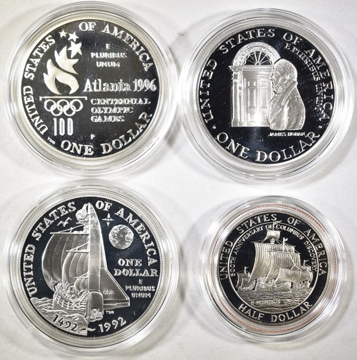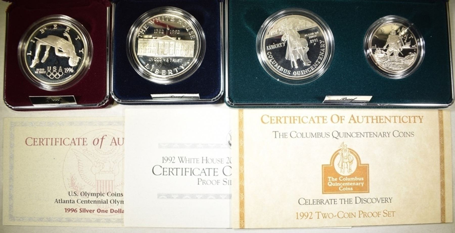 1992 WHITE HOUSE SILVER DOLLAR, 1996 OLYMPIC  TRACK SILVER DOLLAR & 1992 COLUMBUS 2-COIN  SET ALL IN ORIG PACKAGING ESTIMATE $110 -  $130.