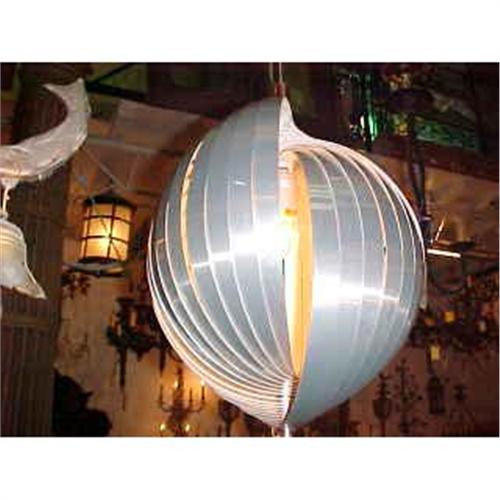 Extremely unusual polished metal hanging sphere chandelier with swirling panels and an interior light. The height is adjustable and is connected with a metal pully. It's present height is 33". A rare and wonderful find!