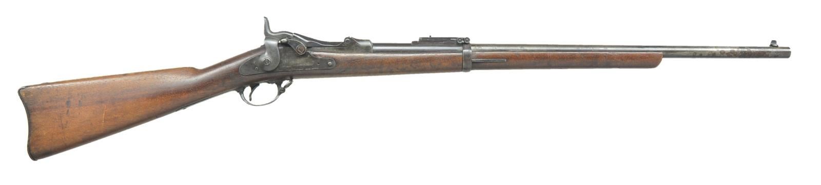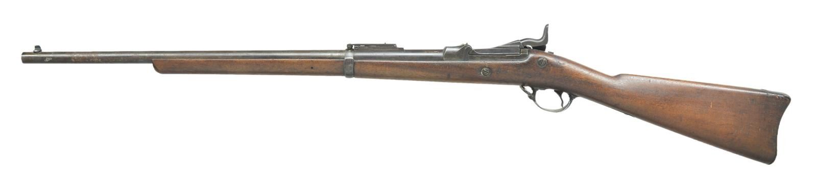 Cal. 45-70. S #316649. Bbl. 26 1/2". Bbl. has Springfield proofs at rear. Breechblock is marked "US MODEL 1884". Lockplate is marked w/ eagle & "US SPRINGFIELD". Buffington rifle rear sight graduated to 2000yds. Aftermarket bead front sight that is missing bead. Cut down walnut stock. Ramrod channel was filled in & is now missing about 2" of filler. CONDITION: walnut stock was sanded long ago w/ 1 1/2" crack behind upper tang, scattered dings & handling marks. Front half of Bbl. is turning to a gray patina w/ oxidation & scattered light pitting. Rear half of bbl., breechblock, hammer, triggerguard and lockplate retain traces of blue finish w/ scattered oxidation & light pitting. Good bore w/ scattered light pitting & frosting but strong rifling. (01-21167/MJC). ANTIQUE. $300-400.