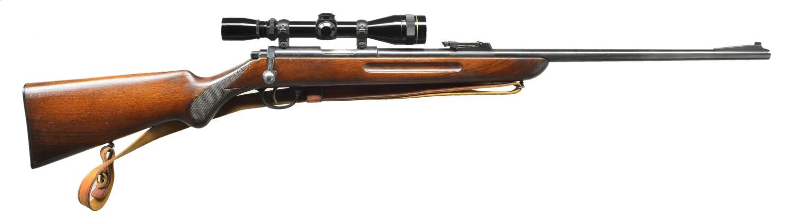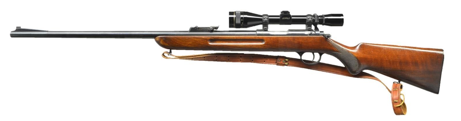 Cal. 22 LR. S #43264W. Bbl. 26". Tangent rear sight graduated to 200m. Ramped blade front sight. Leupold 3-9x power scope mounted on added receiver grooves. Duplex crosshair reticle. Optics have a greenish tint. Markings have white highlight. Walther markings present on rear top of receiver. Left side of reciever & bbl. have eagle N proofs. Top rear of bbl. has Walther Banner & Sportmodell marking. Checkered pistol grip walnut stock w/ black checkered Walther Banner buttplate. Aftermarket leather sling. CONDITION: stock shows added varnish w/ scattered crazing, flaking, scratches & handling marks. Metal retains 60% older reblue w/ a few spots of light oxidation, scattered fading & silvering. Very good plus bore. (22-3220/MJC). MODERN. $400-700.