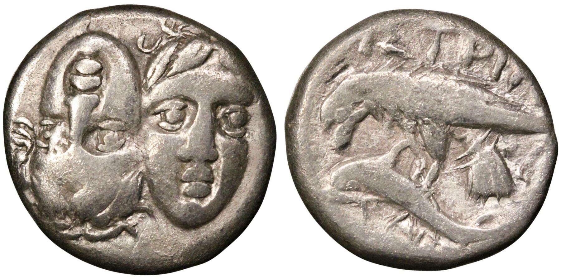 MOESIA: Istros, AR Drachm (4.87g), 400-350 BC. Two male heads side by side, one inverted, reverse eagle standing on dolphin. AMNG 417. Fine to very fine.