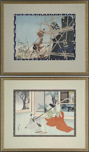 MOGITA TOSHIHIDE (Japanese, Meiji Period) PAIR OF ORIENTAL WOODBLOCK PRINTS. Both identically housed with ivory mattes. One shows a fight on scaffolding around a large Buddha. The other shows a figure in red with long knife outside house. SIGHT SIZE: 13-1/4” x 17-3/4”. CONDITION: Fold at center, generally very good. 9-27667