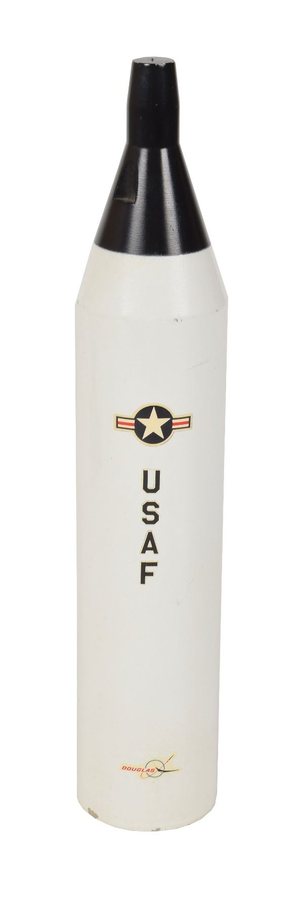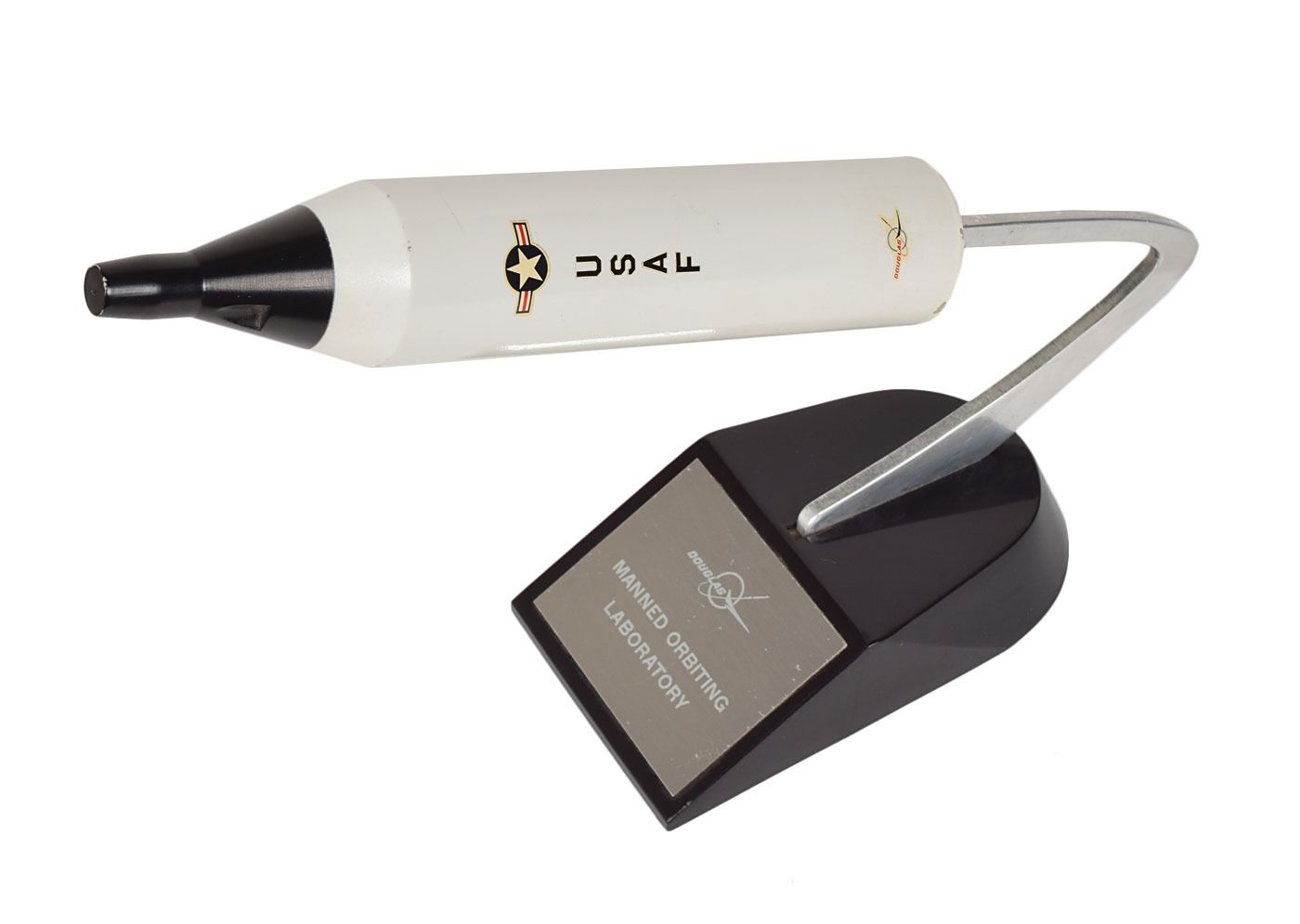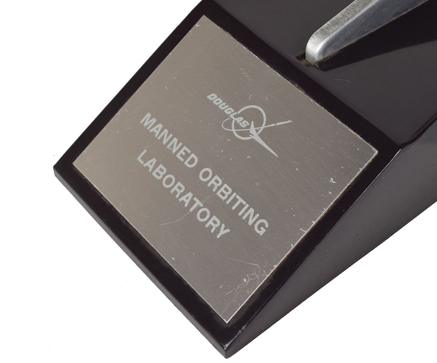 Douglas plastic scale model of the Manned Orbiting Laboratory rocket, measuring 9.75? long, with a black 4 x 6.5 display stand featuring an engraved nameplate. Douglas and USAF decals are affixed to both sides of the MOL. In fine condition, with slight chipping to tip and base of MOL, slight scratching to nameplate, and trivial scuffing; the bottom felt pad to base but no longer present. From the personal collection of Charlie Dry, a former Apollo test astronaut and research engineer and senior scientific analyst at NASA. Part of the United States Air Force's manned space flight program, the MOL was developed from early concepts of manned space stations to be used for NASA survey purposes, but was ultimately canceled during the height of the Apollo program in 1969, when more cost-effective unmanned reconnaissance satellites were found to achieve similar results. NASA's space station program went ahead full-blast in the mid-1970s with the advent of Skylab.
