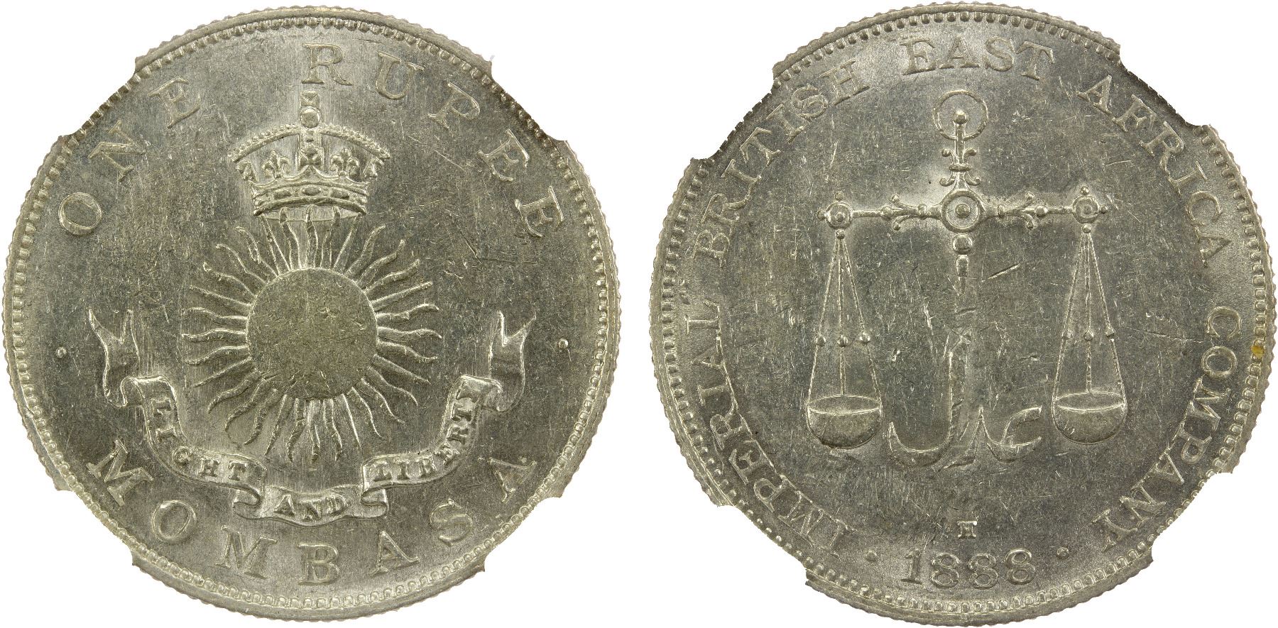 MOMBASA: Victoria, 1888-1896, AR rupee, 1888-H, KM-5, Imperial British East Africa Company, struck at the Heaton Mint, an attractive mint state example, NGC graded MS60.