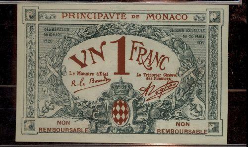 MONACO; ESSAI note 1920 1 franc Uncirculated.