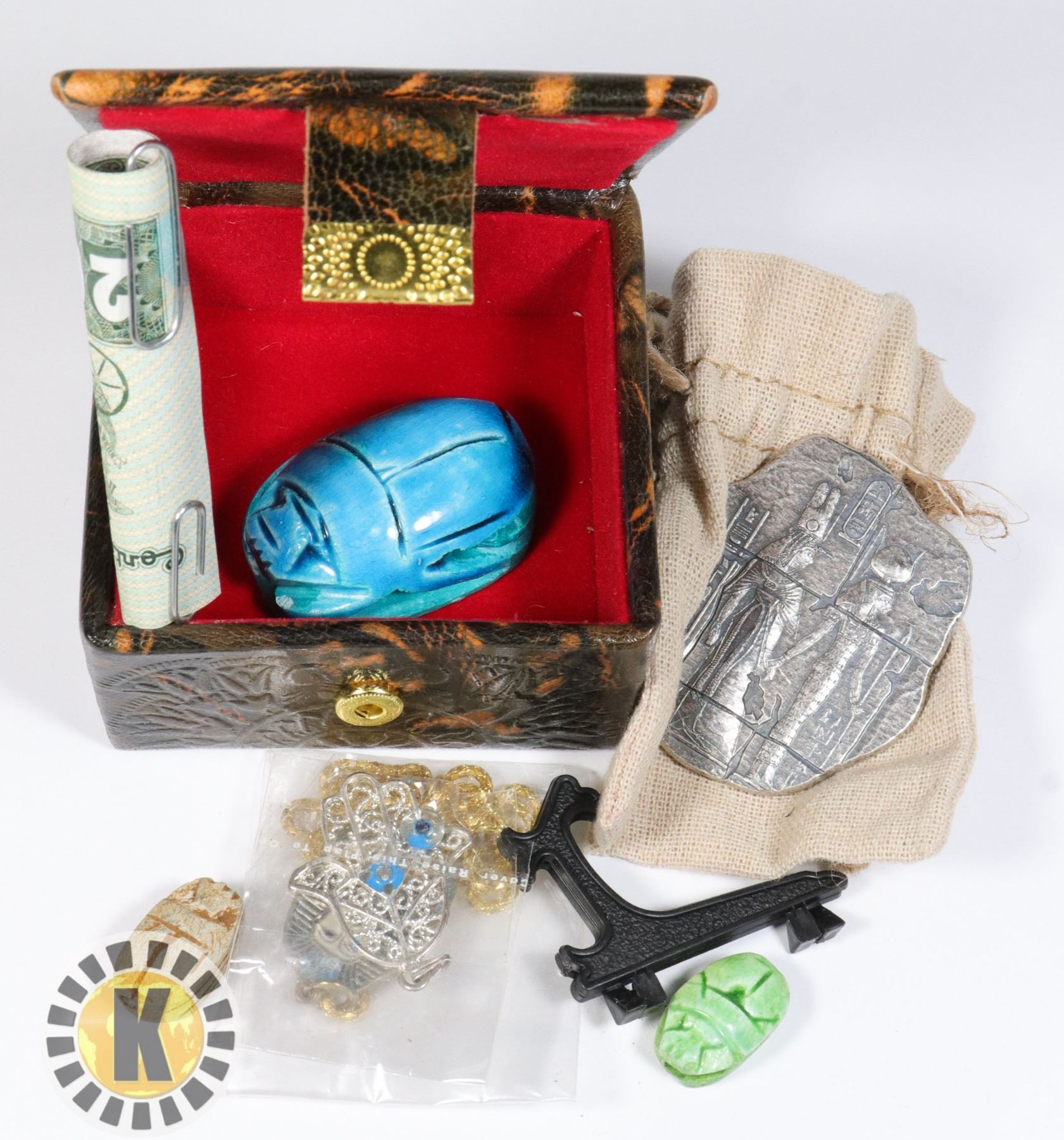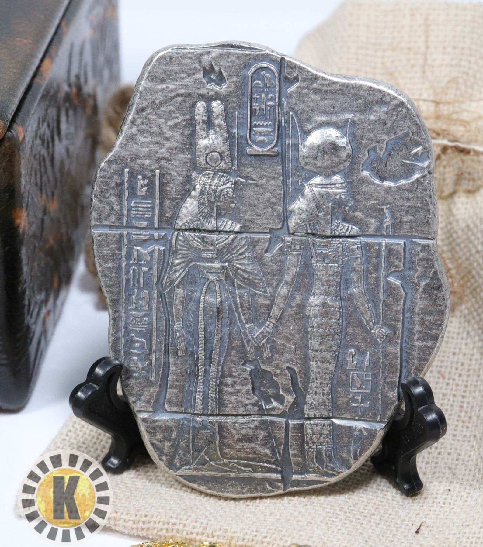 SILVER. ANTIQUED(ANTIQUED COINS ARE BARE HAND FRIENDLY). COMES WITH EASEL, HEMP DRAWSTRING LINEN BAG, BEAUTIFUL LEATHER JEWELRY BOX, ONE LARGE TWO SMALL HAND CARVED LUCK SCARABS, TWO PC OF JEWELRY, GRAPHIC BANK NOTE. ACCESSORIES ALL MADE IN EGYPT.***ITEM(S) LOCATED IN LETHBRIDGE ALBERTA, FREE TRANSPORT TO EDMONTON OFFICE IS AVAILABLE FOR THIS AUCTION