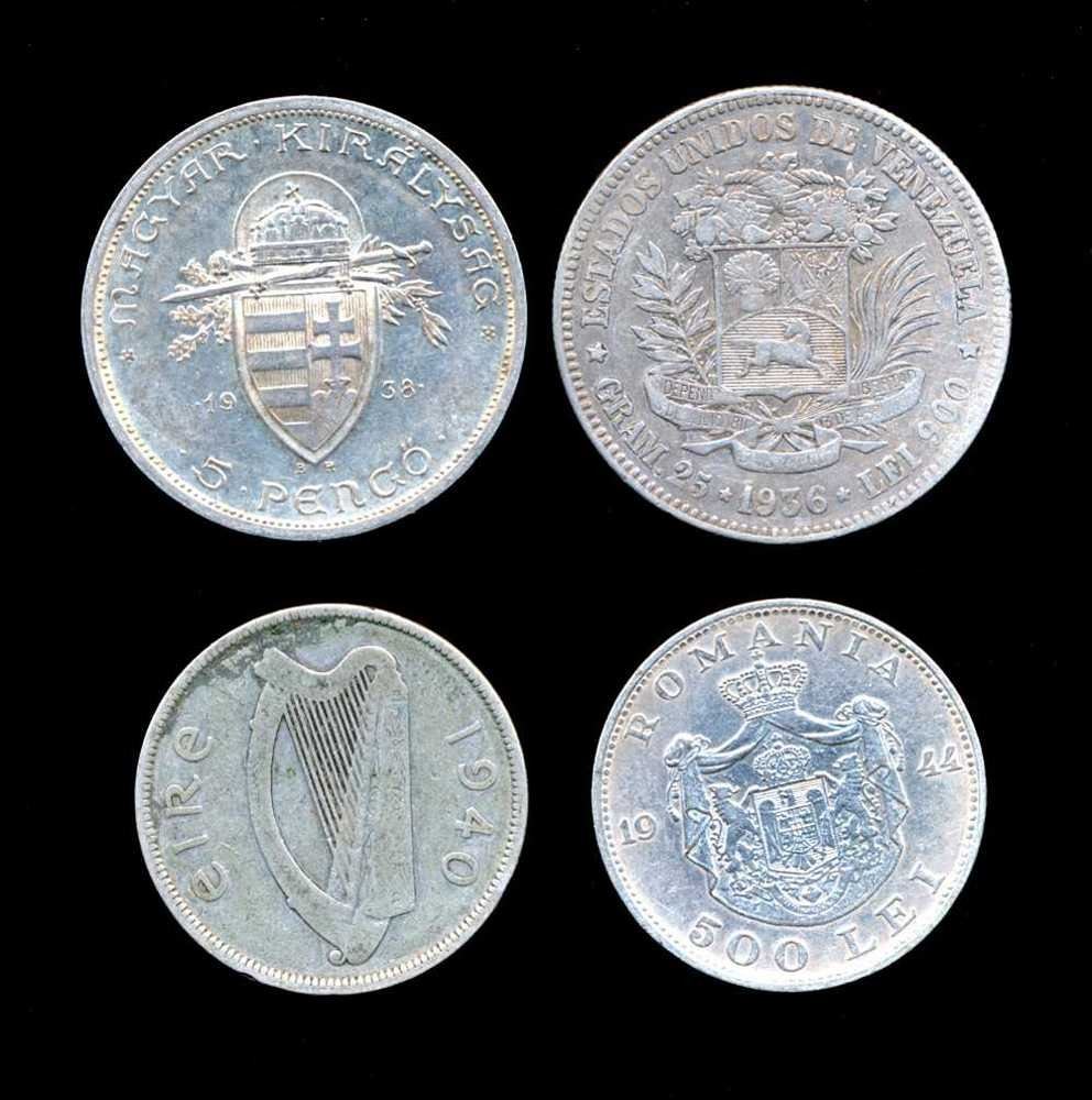 Including 5 pengo 1938 Hungary, 5 bolivares 1936 Venezuela, 2 1/2-shilling 1940 Ireland, 500 lei Romania 1946. ASW 1.848 oz.