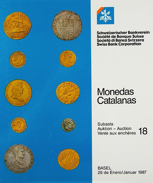 Schweizerischer Bankverein. MONEDAS CATALANAS. Basel, 29. Januar 1987. Small square 4to, original pictorial boards. 151, (1) pages; 1046 lots; illustrated throughout and on 4 color plates. Fine. An important specialized collection.