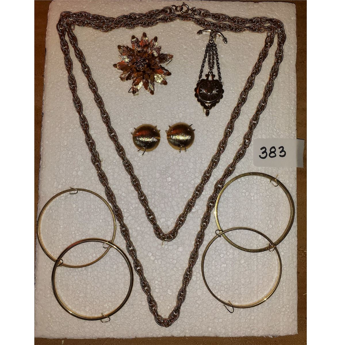 MONET COLLECTION OF THREE BRACELETS, ONE EXTRA LONG NECKLACE, TWO PINS, AND A PAIR OF CLIP ON EARRINGS