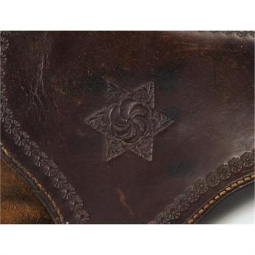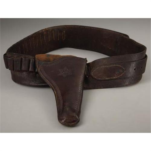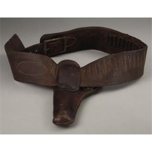 <B>MONEY BELT AND HOLSTER RIG</B></I> - 3”wide cartridge, money belt; circa 1880 with long 45 caliber loops; Holster is a catalogue style with embossed rosette and tall back skirt; fits a 4¾ Colt S.A.A; circa 1900.<BR><BR><B>Condition</B></I>: Belt is age cracked and has been re-stitched; Holster is in fine to very fine condition<BR><BR><b>Shipping:</b> Miscellaneous Collectibles, Larg (<a target="_blank" href="http://www.heritageauctions.com/common/shipping.php">view shipping information</a>)
