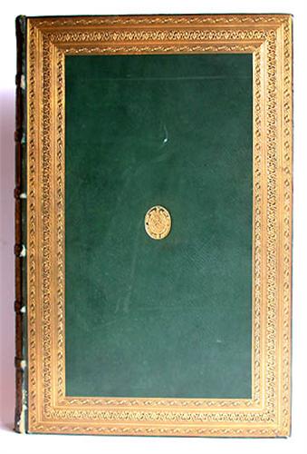 MONGEZ.- Tableaux, statues, bas-reliefs et camées de la Galerie de Florence et du Palais Pitti. Dessinés par Wicar, peintre, et gravés sous la direction de C.L. Masquelier [...] avec les explications par Mongez. Paris, Lacombe peintre de l'ouvrage (de l'imprimerie de la Galerie de Florence), 1789 [- 1814]. 4 tomes en 2 vol. in-f° (rousseurs surtout dans le tome I). Rel. du XIXe s. : plein maroquin vert Empire, plats armoriés cernés d'un large cadre de roulettes et filets dorés, dos à nerfs et caissons entièrement fleuronnés dorés, doublures de papier rouge grenat serti de maroq. vert, gardes volantes de même papier, tranches dorées (mors et coupes frottés, qqs épidermures).