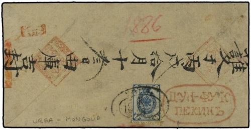 1884 (Oct 28) Red Band envelope used to Peking franked by Russia 1883 7k. blue tied by oval URGA datestamp in black. A fine and very scarce cover. Scott 35.