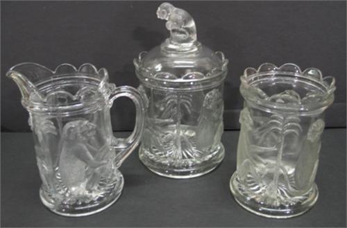 3 PIECE MONKEY & PALM TREE DECORATED GLASS CANISTER SET. Consists of sugar, creamer, and covered canister. All are decorated with monkeys and palm trees. Covered canister: 7.25” H