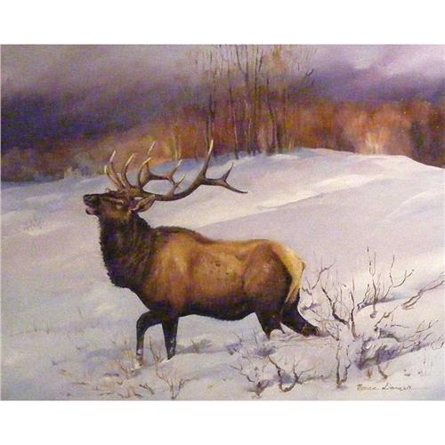 Monna Dancer's rendition of an Elk in the Snow. Oil on Canvas. Framed size is 24'' x 25''