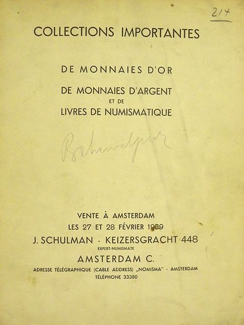 Schulman, J. CATALOGUE DES COLLECTIONS IMPORTANTES DE MONNAIES D'OR ANTIQUES, DE MONNAIES D'OR D'EUROPE ... Amsterdam, 27-28 février 1939. 4to, original printed card covers. (2), 51, (1) pages; 1068 lots; 14 fine plates. Very good. A rarely encountered sale. Spring 702.