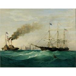 MONOGRAMIST IFA 19th century Marin med segelfartyg bärande amerikansk flagg Signed with monogram IFA. Oil on canvas, 48 x 63 cm.