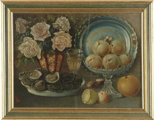 MONOGRAMMED "VL" (Early 20th Century) STILL LIFE WITH OYSTERS AND FRUIT. Depicting plate of oysters, a beautiful vase of white and pink roses and a bowl filled with fruit (primarily peaches) together with a glass of wine. Monogrammed "VL" and dated "1908" in lower left. SIGHT SIZE: 15-1/2"l x 11-1/4"w. CONDITION: There is a tight 6" separation on the upper portion of the painting; otherwise colors have a very nice muted antique look with strong graphics. Very appealing. 9-28054