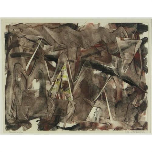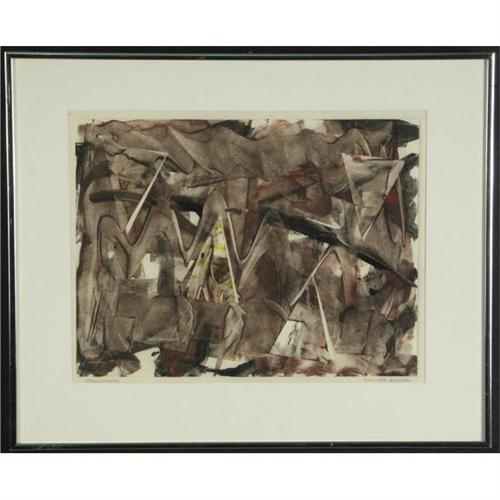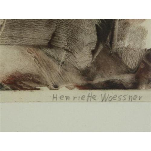 MONOPRINT COLLAGE, Henriette Woessner (1905-), WA. ''Chronometer''. Signed lower right. Titled lower left. Exhibition label from Women Painters of Washington on the verso. Matted and placed in a metal frame. More info at the front desk. 12'' x 15.75''/ 18.25'' x 22.25'' framed.