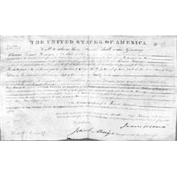 (1758 - 1831) Fifth President of the United States who negotiated the Louisiana Purchase and promulgated the Monroe Doctrine. Partly-printed D.S. as President, 1p. sm. folio, Wasgington, Feb. 7, 1822, a grant of 80 acres of land in Ohio to one Samuel Heninger. Very light damp stain along folds, very nicely signed, overall quite good.