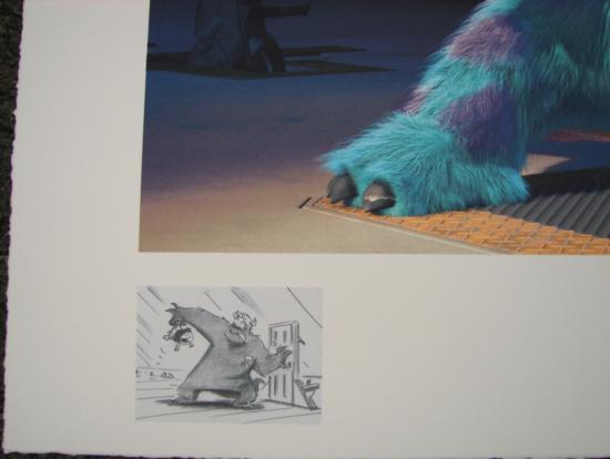 As a special embellishment, the paper version of "Scared Sulley" also includes a giclée printed reproduction of a story sketch from Monsters, Inc., and a printed Monsters, Inc. logo as the seal. Additionally, each sheet is deckled and hand numbered.