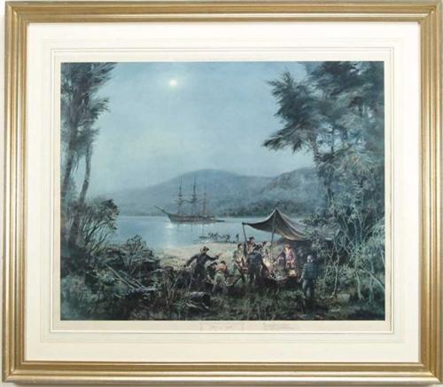 MONTAGUE DAWSON (American, 1895-1973) “PIECES OF EIGHT”. Limited edition pencil signed print by Venture Prints LTD of Bristol, England. Published in 1971. Pencil signed middle right and blind stamped on lower left. The scene shows a group of pirates splitting up treasure while their three-mast pirate ship is anchored in cove under moonlight. Nicely housed in a silver gilt molded wood frame with watercolor highlighted matte. PROVENANCE: Purchased from Shreve, Crump & Low Boston, Mass 1976. SIGHT SIZE: 26” x 31”. CONDITION: Very good. 9-26272