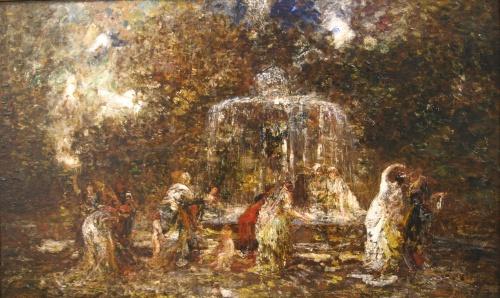 MONTICELLI, Adolphe, 1824-1886. “Bathing at the Fountain”. Huile sur panneau, signée. École française. Oil on board, signed. French School. 16 ½” x 27 ½” – 42cm x 69.8cm.