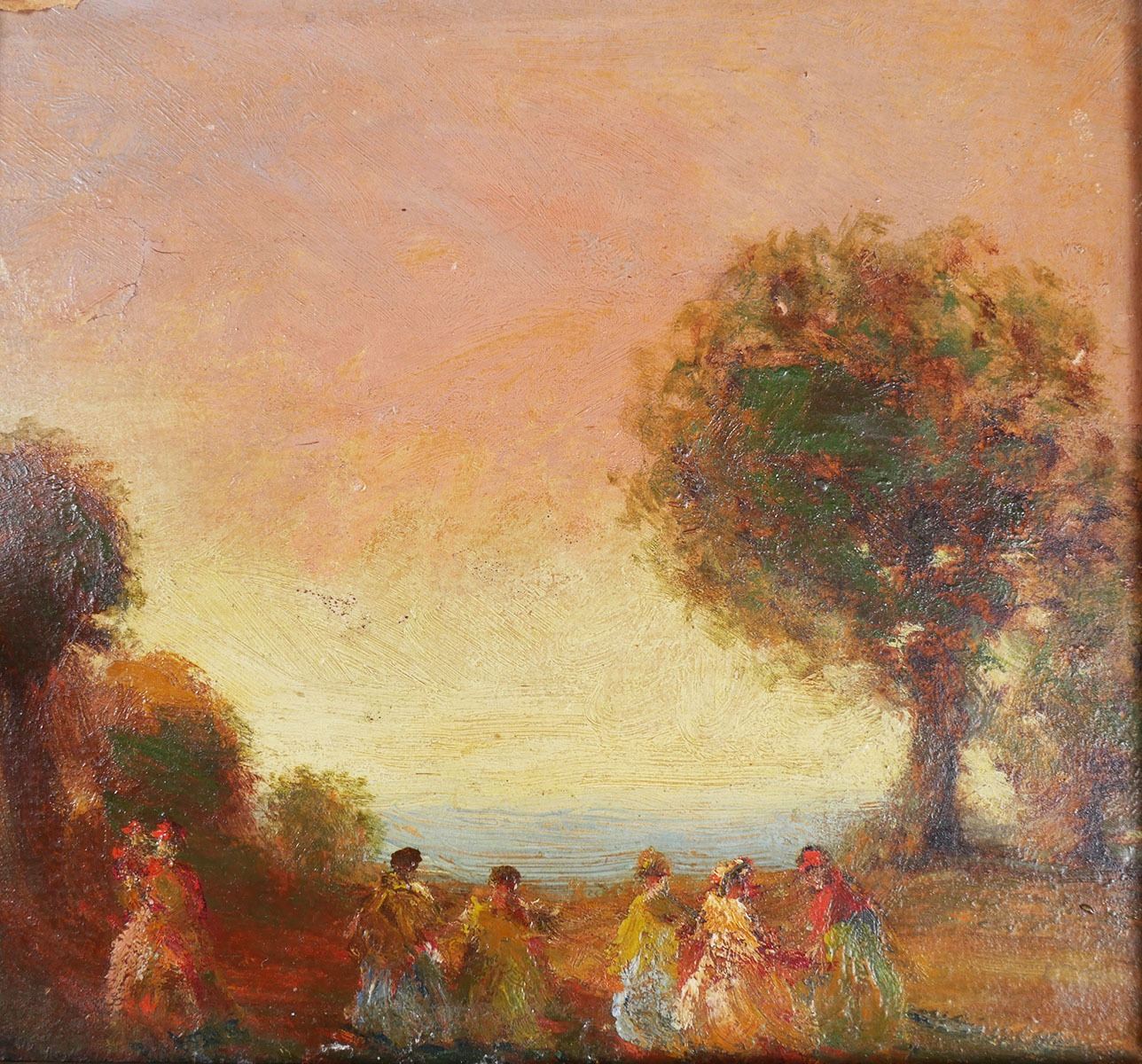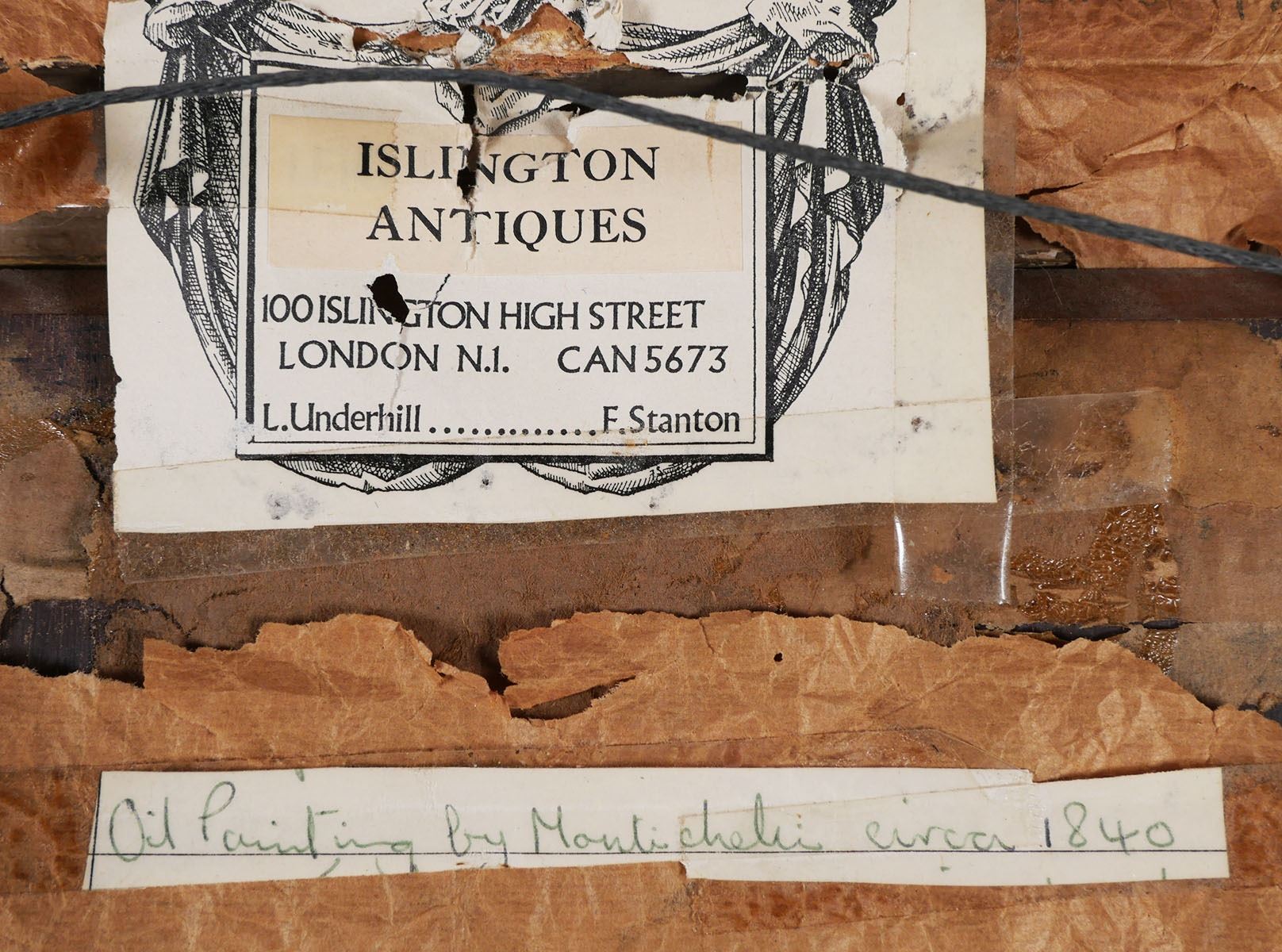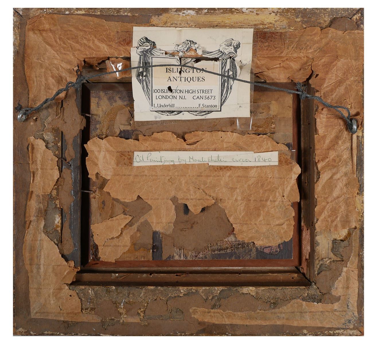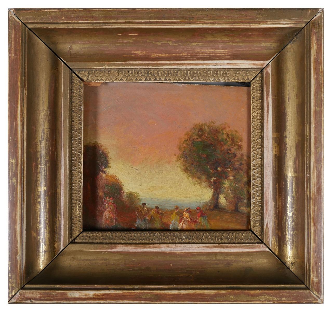 Oil on board landscape with figures. Unsigned, attributed by cut label verso to Adolphe Monticelli. Label states "Oil Painting by Montichelli, circa 1840." Board measures approximately 7" x 6", framed to 11" x 10". Good condition with minor wear at edges. Period framing shows wear. Sits somewhat loose in frame.