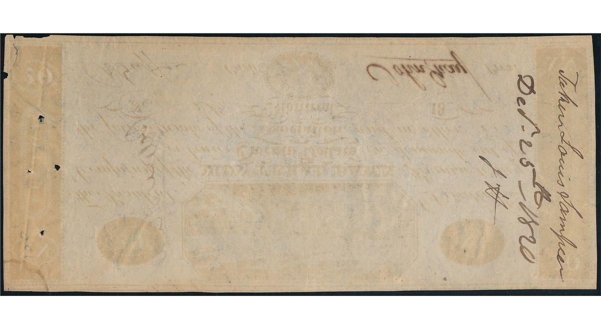 MONTREAL BANK. Montreal, Lower Canada. $20.00. 18--(ca. 1817-1822). CH-500-10-20C. Signed R. Griffin/John Gray. Believed to be a deceptive contemporary counterfeit. 'Police Office" written vertically on the face of the note."Taken Louis Lampcer-Dec. 25th 1820" on back. Pin holes at left. Very Fine.