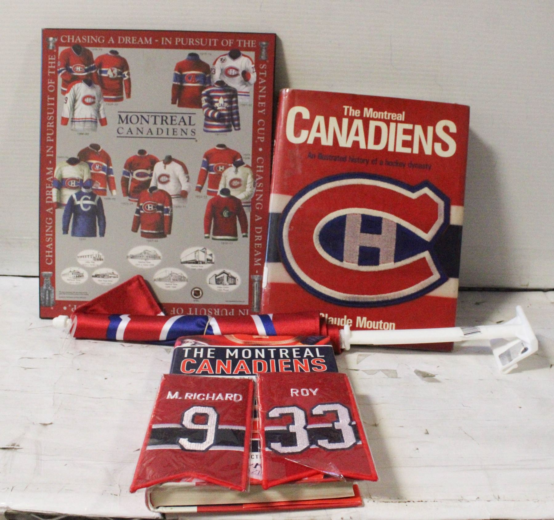 2 BOOKS, PLAQUE, BRAND NEW CAR FLAG, MINI JERESY BANNERS FOR PATRICK ROY AND MAURICE RICHARD