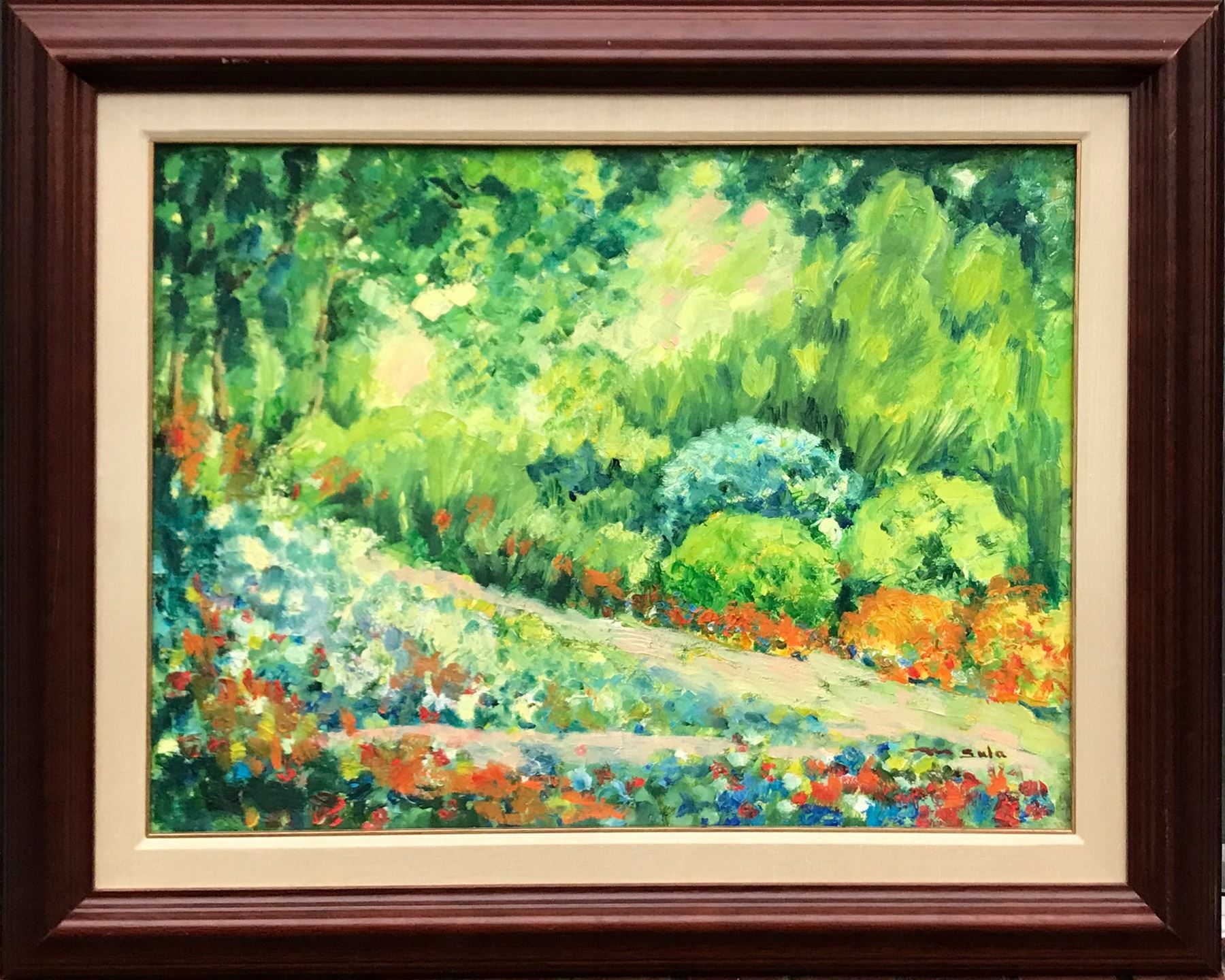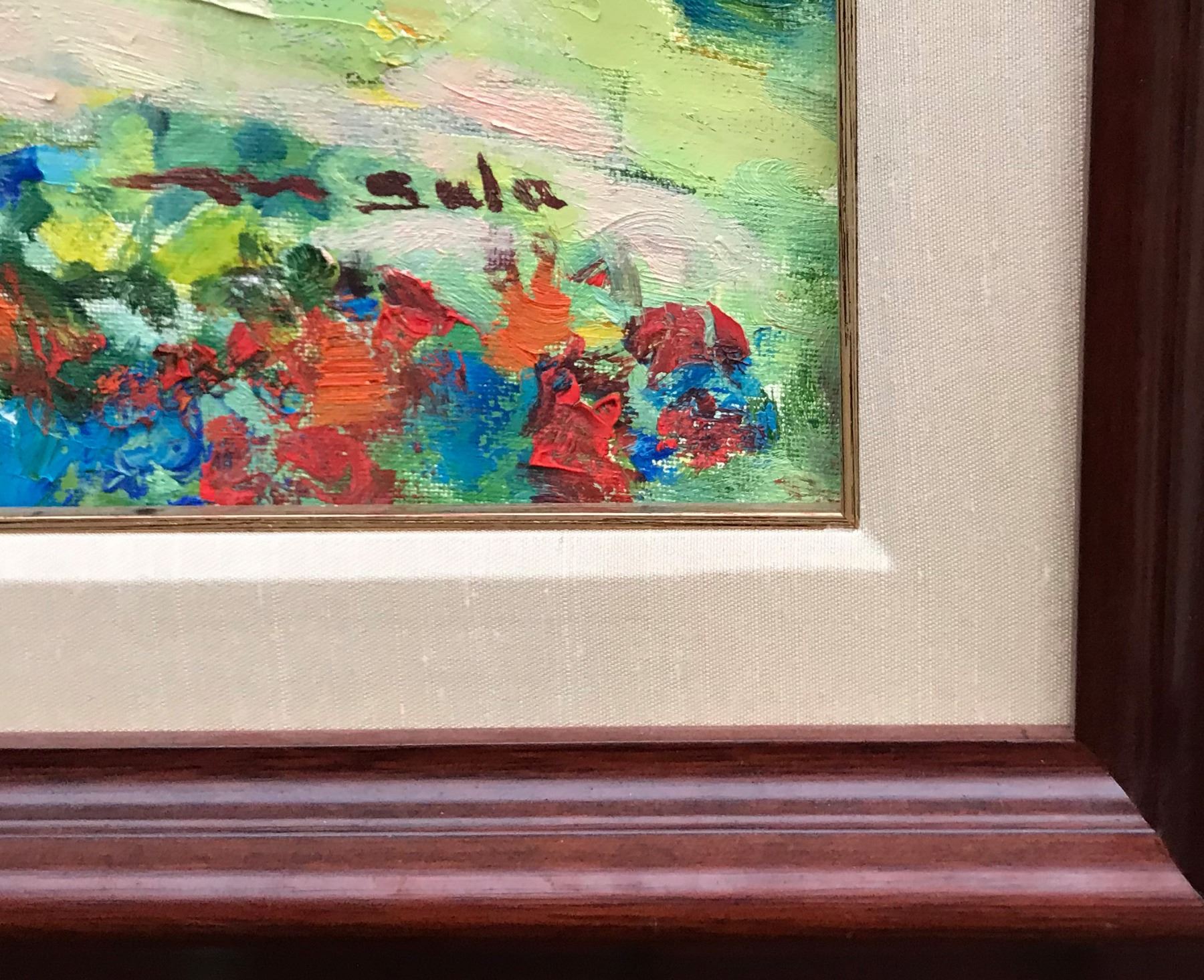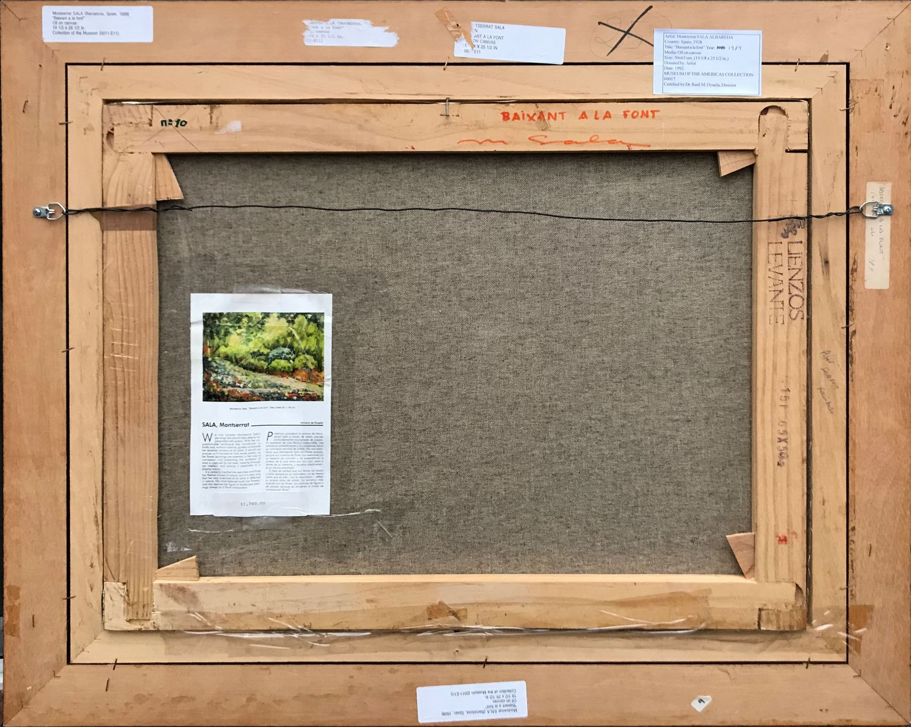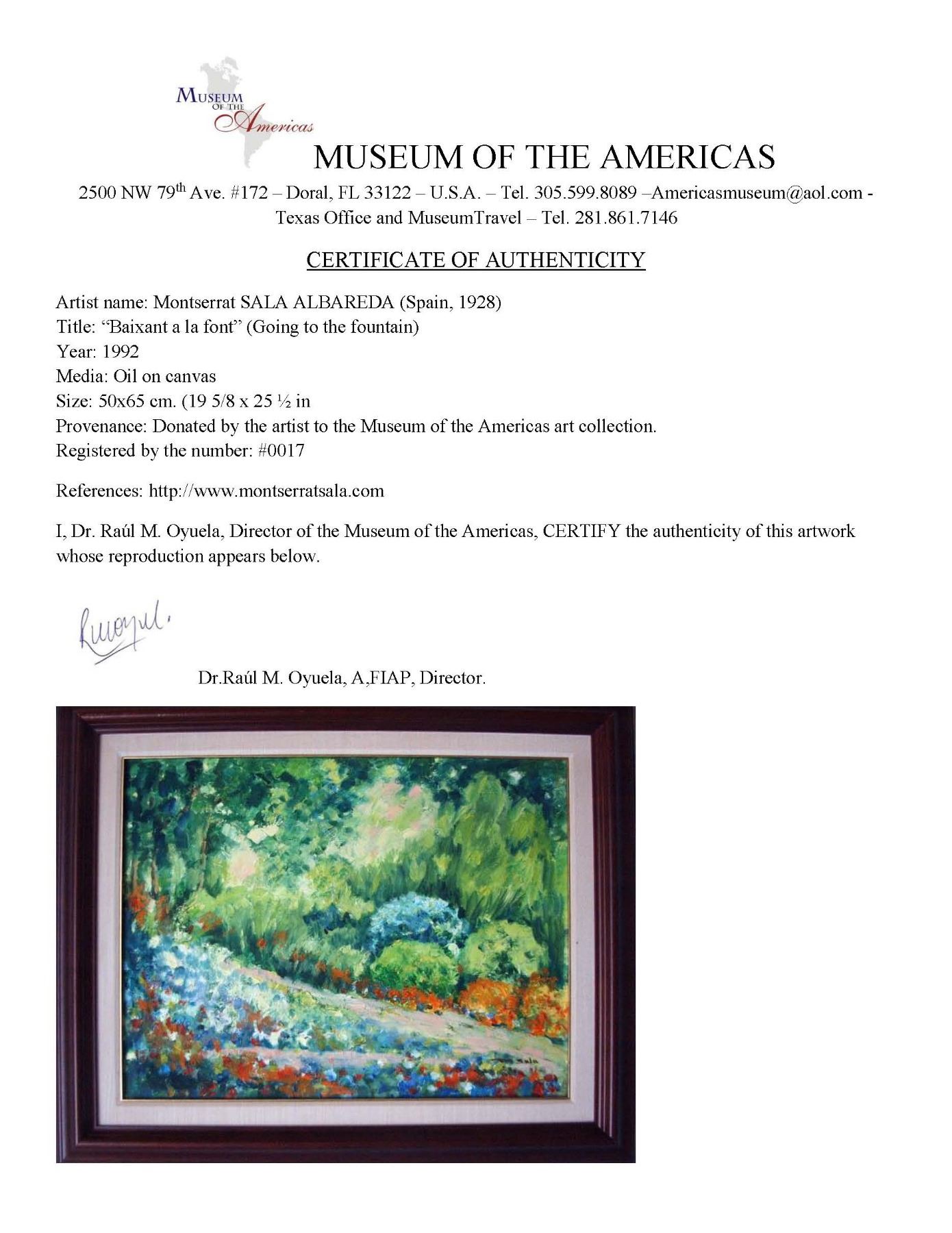 Oil on canvas, landscape scene, entitled, "Baixant a la font" ("Going down to the fountain"). Signed Montserrat Sala Albareda (Spanish, b. 1928) on the lower right corner. 50 x 65 cm. (19.5 x 25.5 in.). PROVENANCE: Donated by the artist to the Museum of the Americas (Doral, Florida, United States)