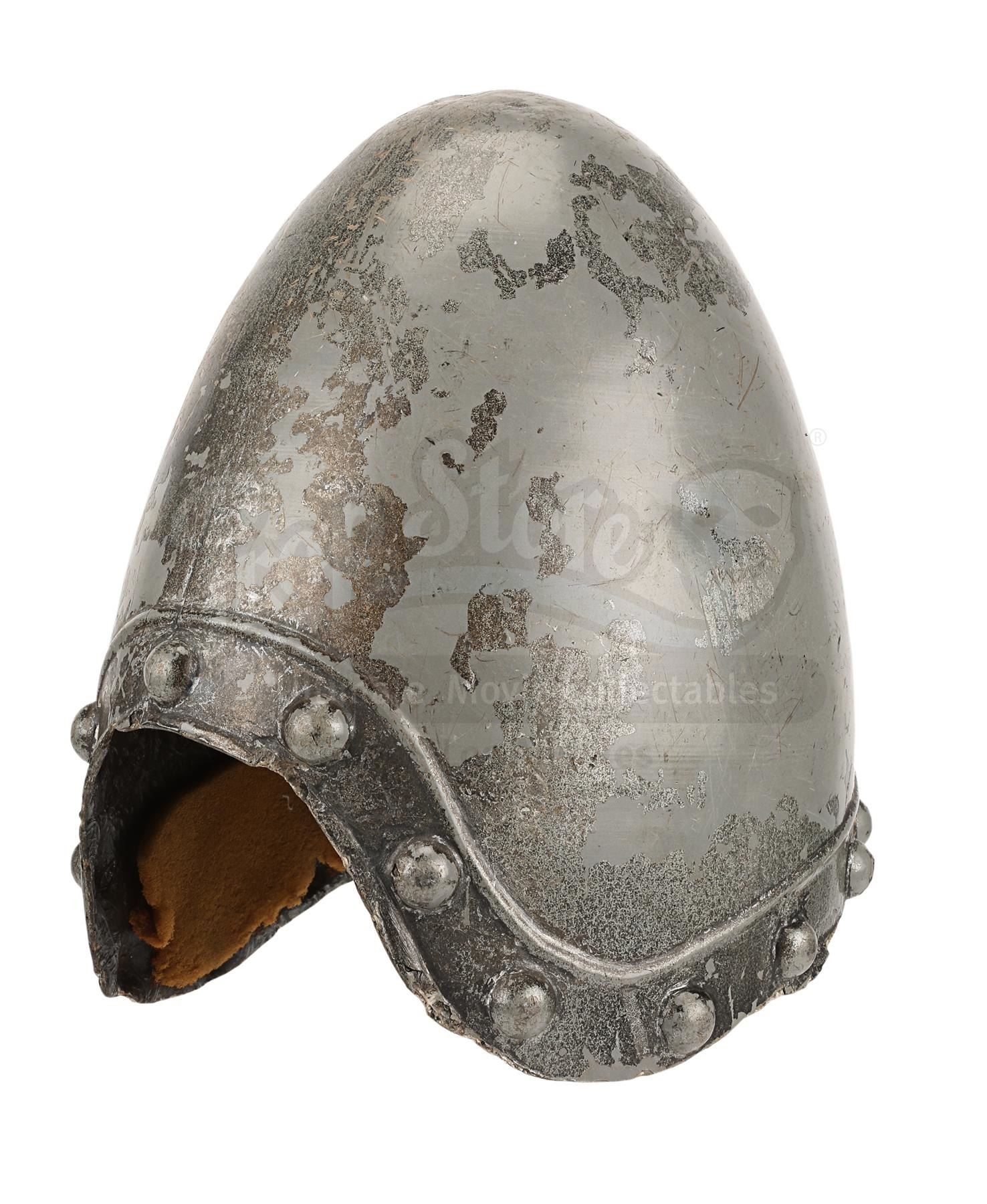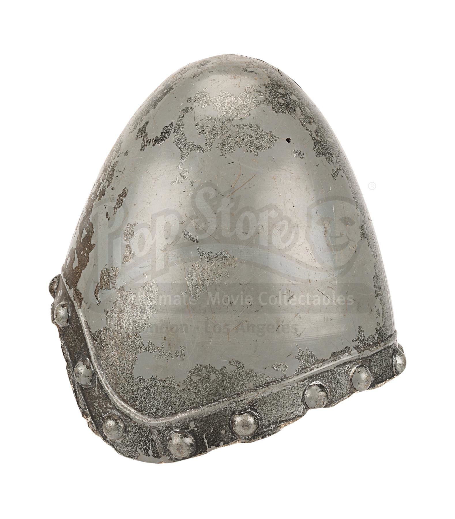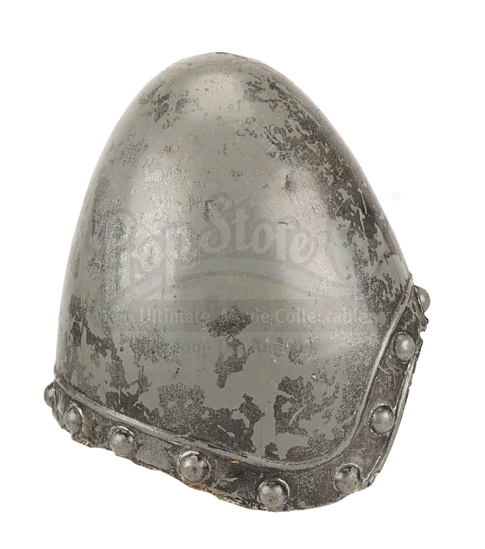 A French taunter's helmet from Terry Gilliam and Terry Jones' cult comedy Monty Python and the Holy Grail. French knights wore their helmets as they taunted King Arthur (Graham Chapman) and his knights from the parapet of their castle, before hurling various animals at them.
