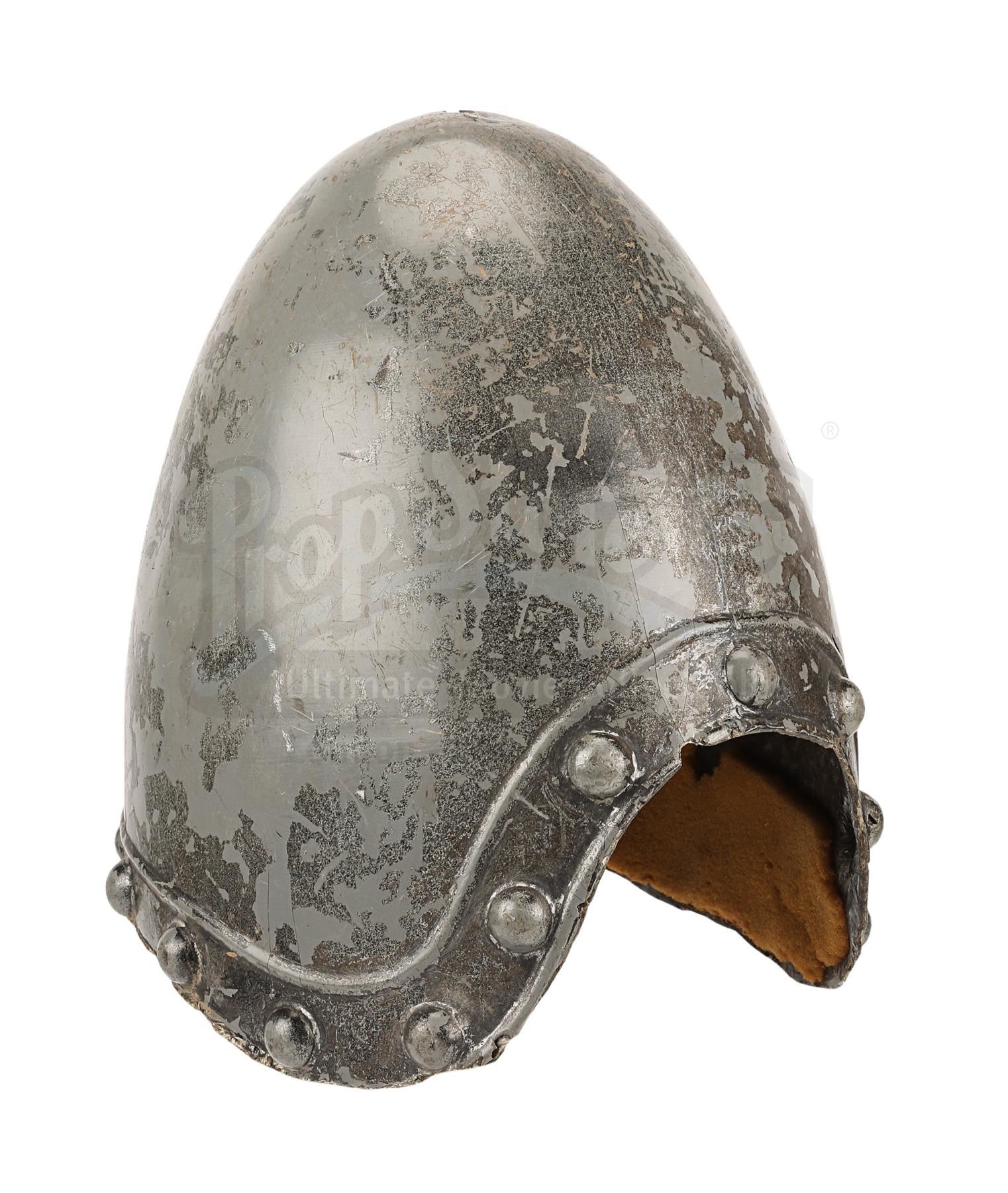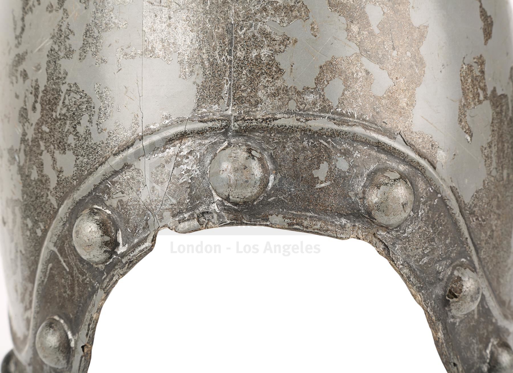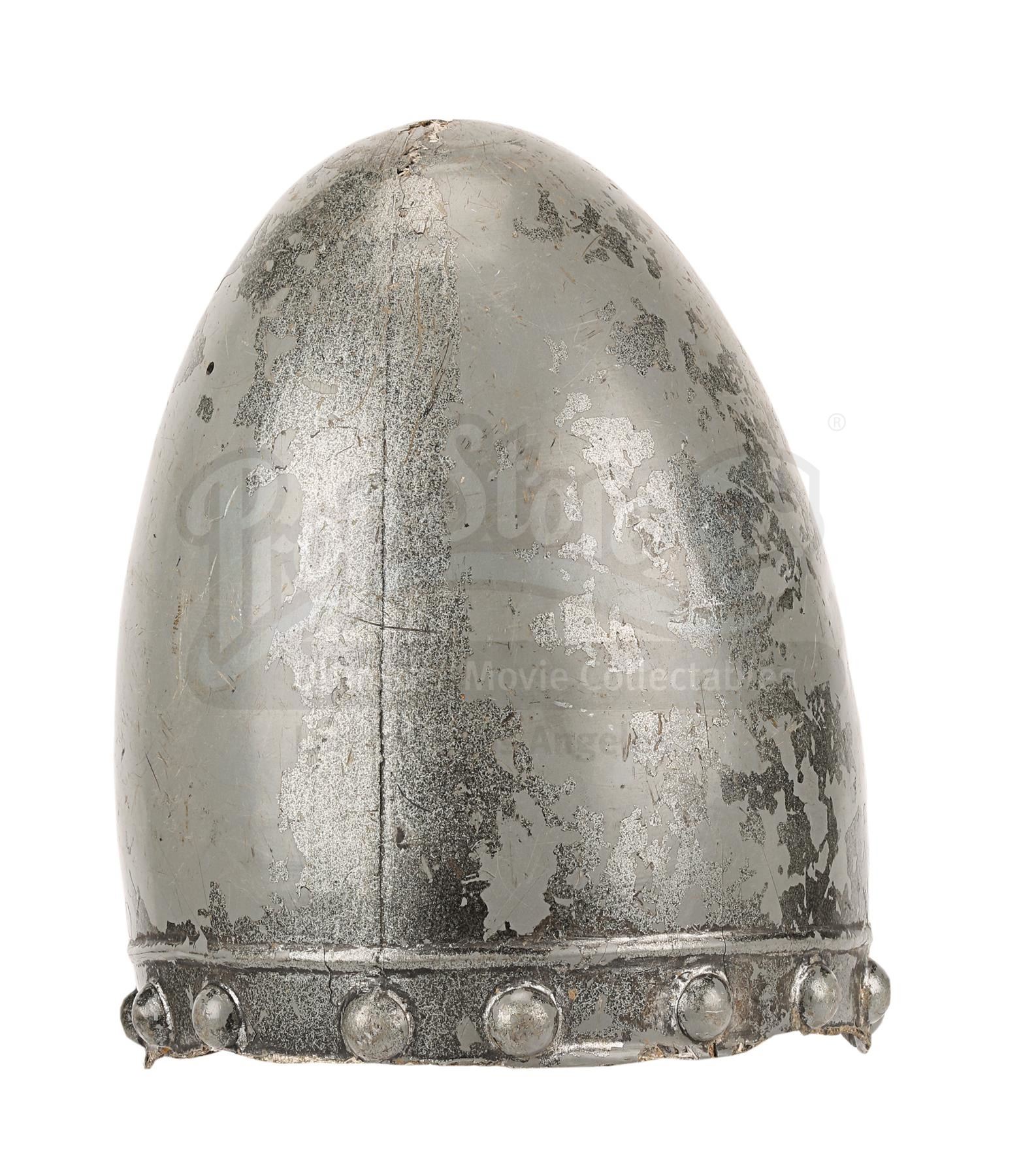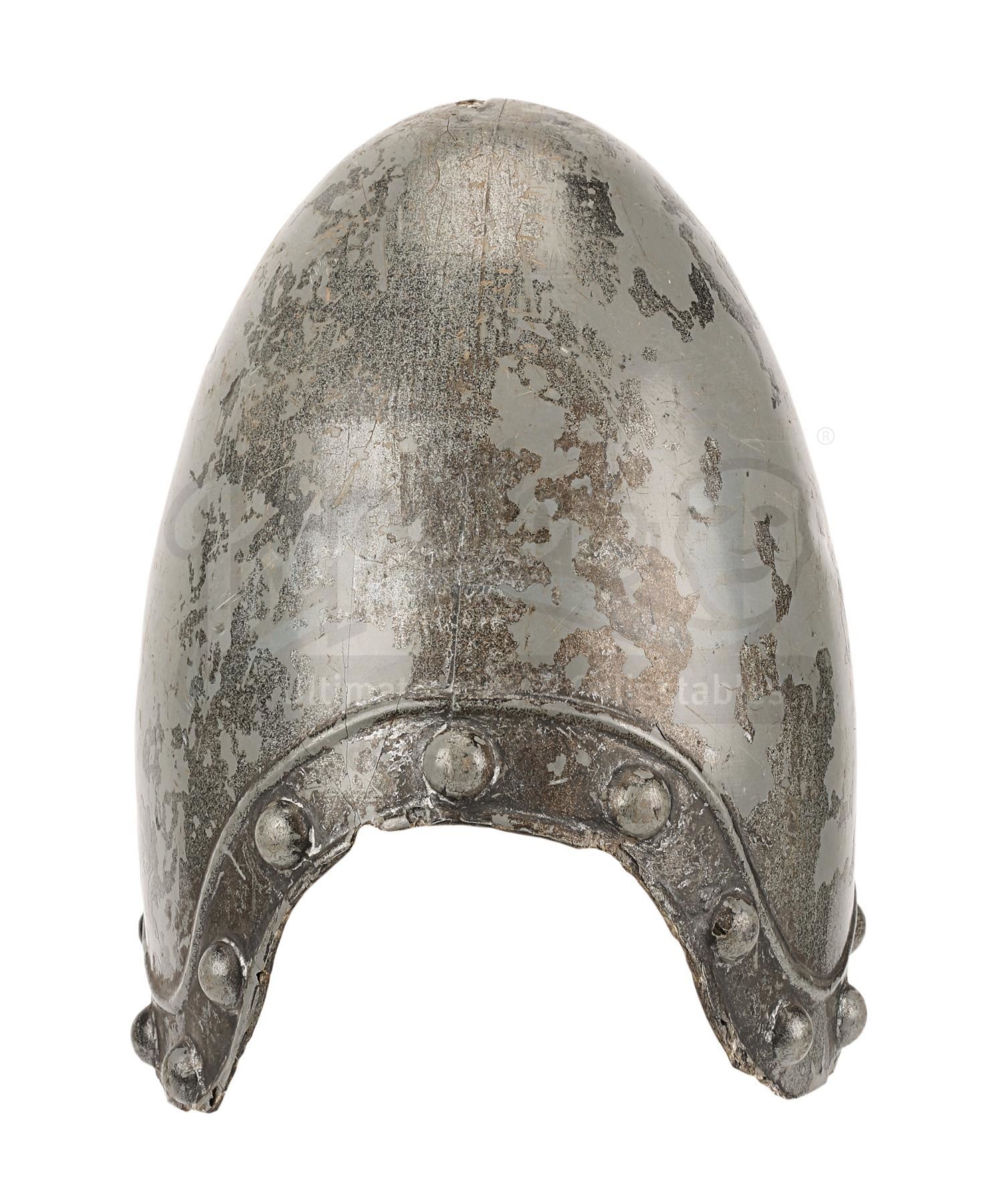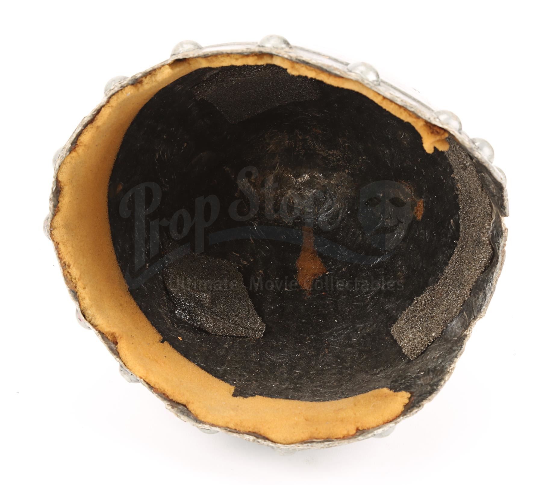 This tall, domed helmet is made from cast fiberglass with faux-rivet detailing and is painted with faux-silver and dull grey paint to resemble metal. Foam is fitted inside for the comfort of the wearer. The piece has some wear from production use and age, including a crack on the top of the dome, revealing the fibreglass underneath. The silver paintwork has come away over time and the foam inside is fragile.Dimensions: 24 cm x 22 cm x 19 cm (9 1/2" x 8 3/4" x 7 1/2")