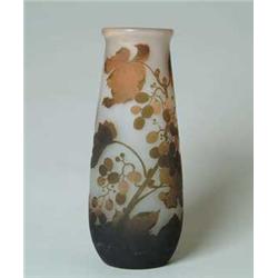 Lot 1253 MONUMENTAL ARSALL VASE. Nice cameo vase has brown and peach grape leaves, vines and grapes against a frosted cream to light pink background. Signed on side in cameo "Arsall". SIZE: 14-1/2" t. CONDITION: Couple of very minor fleabites to cameo edge, otherwise very good to excellent. 5-68796 (1,000-1,500)