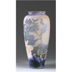 Lot 737 MONUMENTAL GALLE HYDRANGEA VASE Spectacular monumental vase has beautifully detailed cameo hydrangeas in lavender and green against a mottled and shading salmon ground. Signed on side in cameo “* Galle”. SIZE: 18” t. CONDITION: Very good to excellent. 5-70983