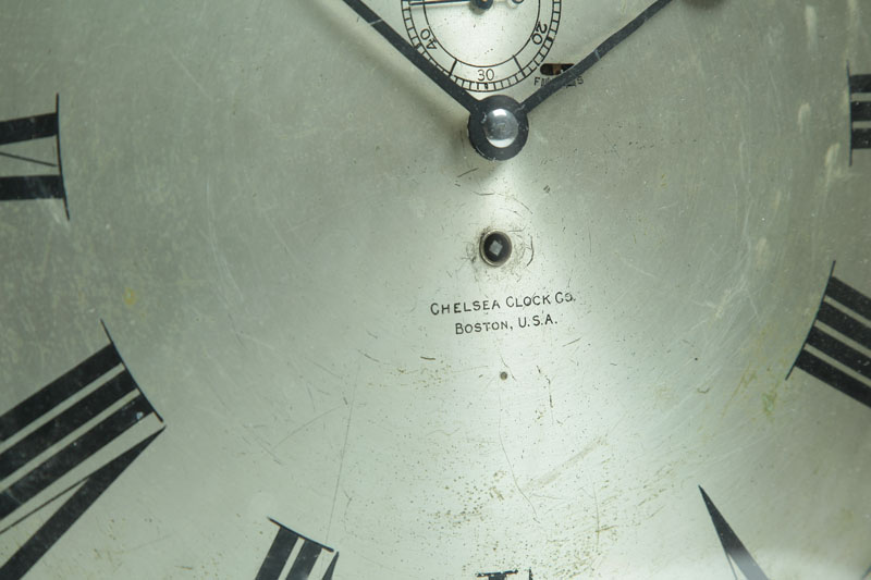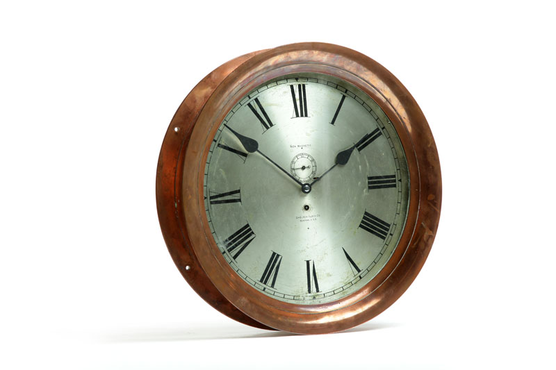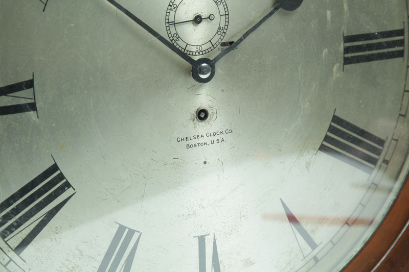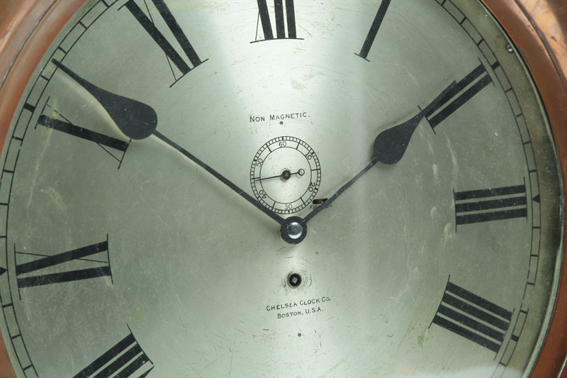 Chelsea Clock Company, Boston, Massachusetts, early 20th century. Silvered dial with Chelsea mark, "Non Magnetic," and Roman numerals. Red brass case. 16"d. (dial), 18 3/4"d. (case).
